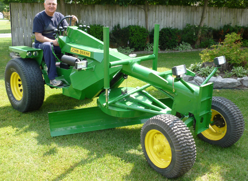 Thanks ,<img src="http://www.tractorbynet.com/forums/files/build-yourself/384542-mini-road-grader-garden-tractor-aaatestdrive-jpg"/>Thanks , It would be fun to take several of my little tractor projects to a show . Probably Buckley south of Traverse City if we take them. Today I fired the grader up and raised the six foot blade and drove it out of the workshop for the first time. It was fun to drive but hard to steer . I got to find a small steering gear box for it to make it steer easier. But overall it is a unique looking garden tractor. My wife just downloaded a video of me driving it at doncampbellequipment if anyone would like to see it in action.