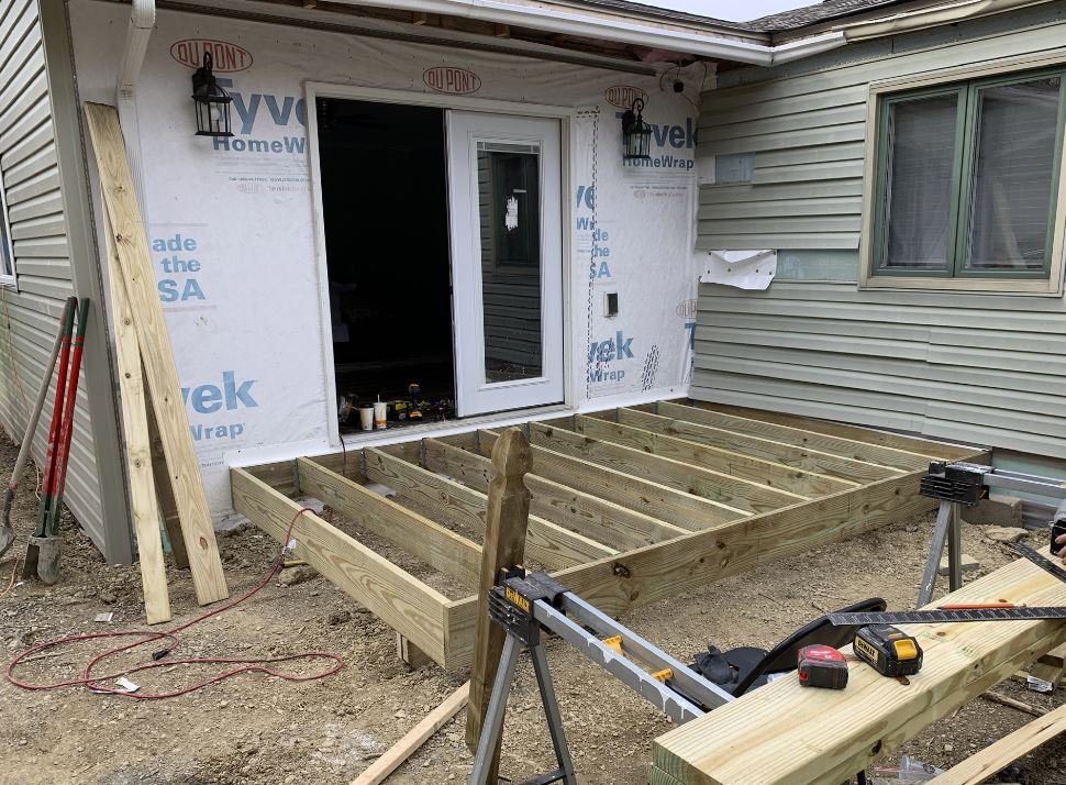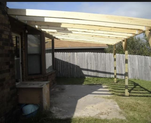 Here is a picture of the partially finished deck. The roof frame would attach to the wall above the door and right below the overhang. The overhang sticks out about 18". I can't extend it from the facia board of the overhang since the 2 roof lines meet there and create a valley. I only have about 1 foot to drop from the wall to the front of the porch. Any lower and it will be too low in the front.