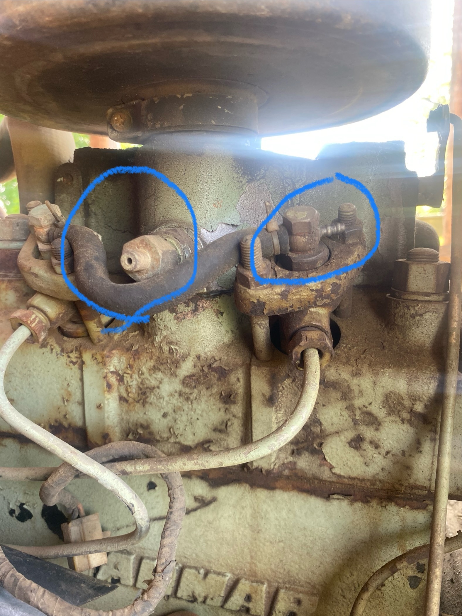 You have two unrelated things there. The line between injectors should continue to a small plastic nipple at the top of the fuel tank, as you described for the Deutz. On some later models, it feeds the Thermostart reservoir before getting to the tank.