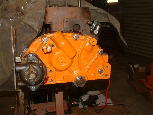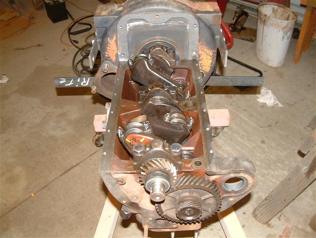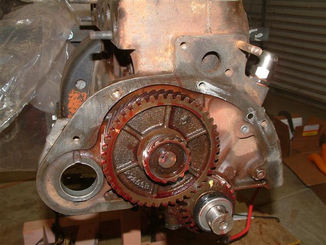 The timing gear cover, governor and distributor installed.