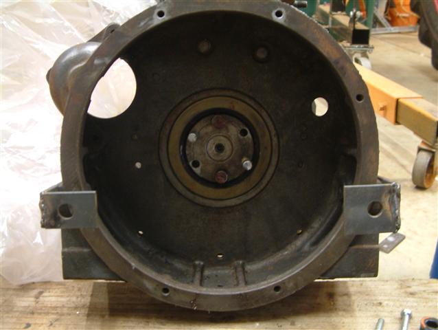 The big hole in the housing is for the starter, the small hole is for timing. You can see the large seal between the flywheel housing and the flange on the end of the crankshaft.