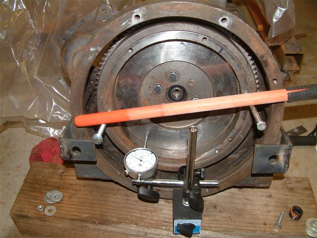 Checking the flywheel wobble with a dial gauge (has to be within +/- 0.005"). The two long bolts threaded into the flywheel and the short steel rod make it easy to spin the flywheel for this measurement.