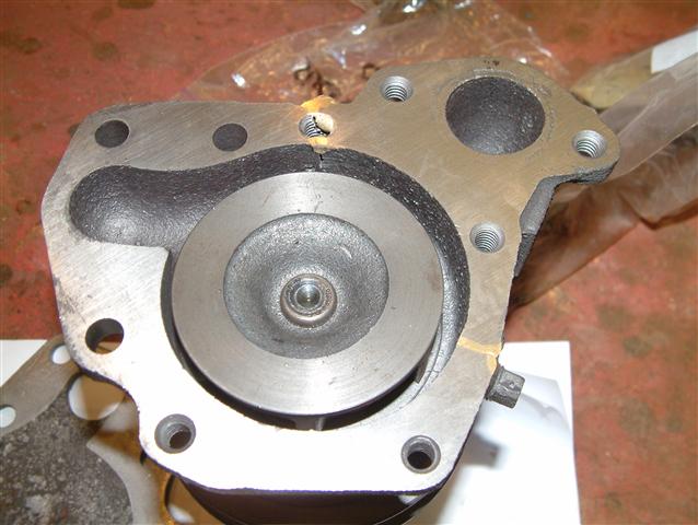 The rebuild kit for the water pump arrived. Problem: the pump shaft is frozen in the bearing and the bearing is rusted to the cast iron pump housing. Couldn't get the bearing out with my press so off to the machine shop. No problem getting the old bearing out, but the housing cracked in half. Not to worry--Ron, the machinist, brazed the housing together, installed the new parts and cleaned up the pump so it looks like new.