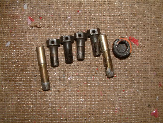 Here are the fasteners--four bolts with holes for safety wires. I made two studs for installing the flywheel by cutting the heads off long bolts. The plastic cap covers the timing hole on the flywheel housing.