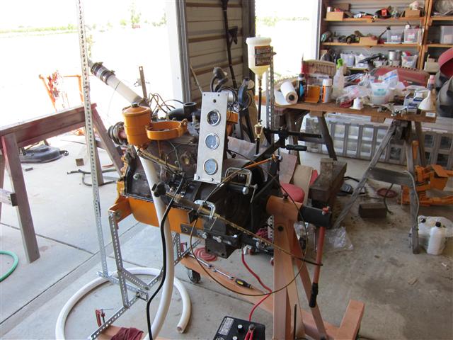 Added gauges. Rigged a gas tank using a paint cup from my Harbor Freight HVLP gun. Oil in the crankcase with Lucas break in oil added. Water in the block (no flow for now). Alternator not installed (run ignition off the battery alone).