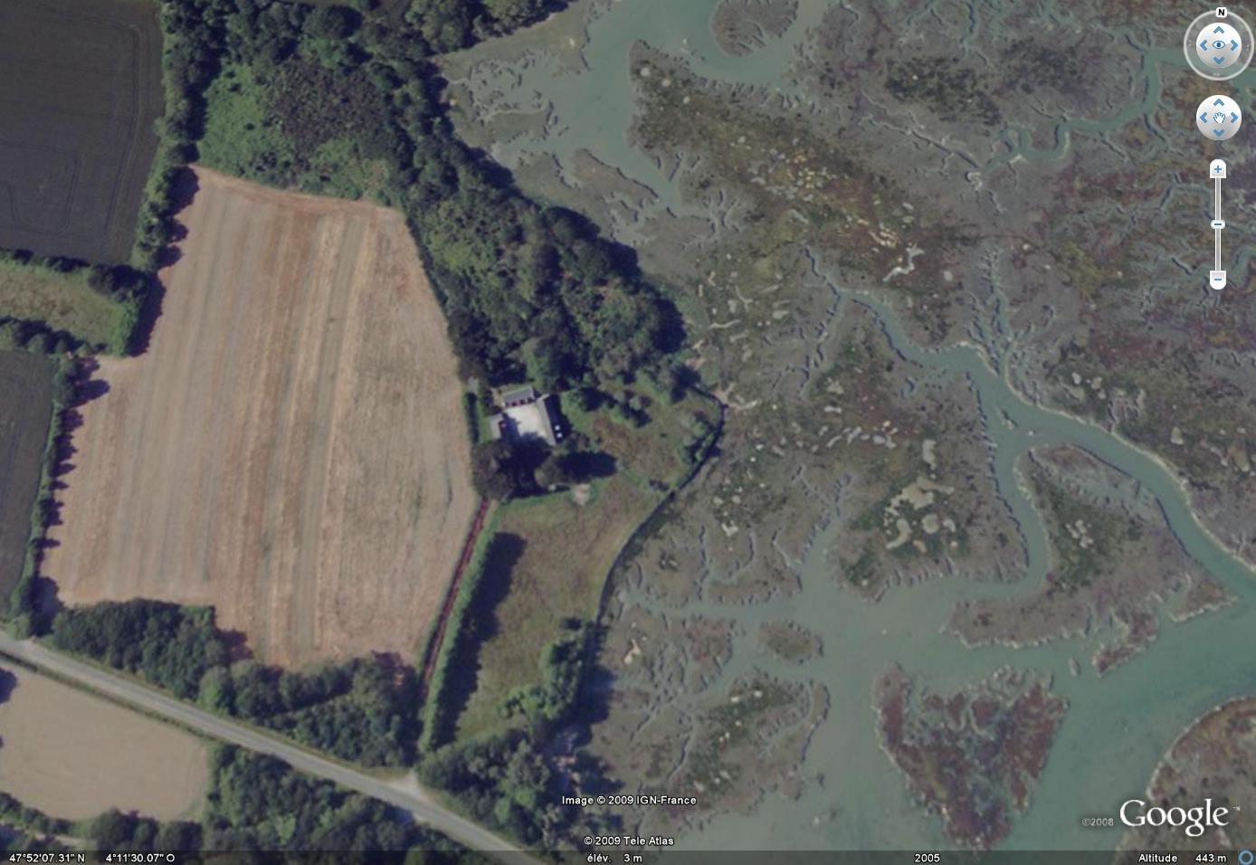 I can't fly but here is the Google Earth picture of my place in Brittany. The grey/brown right half of the photo is our side of the Atlantic ocean, apparently taken at low tide.