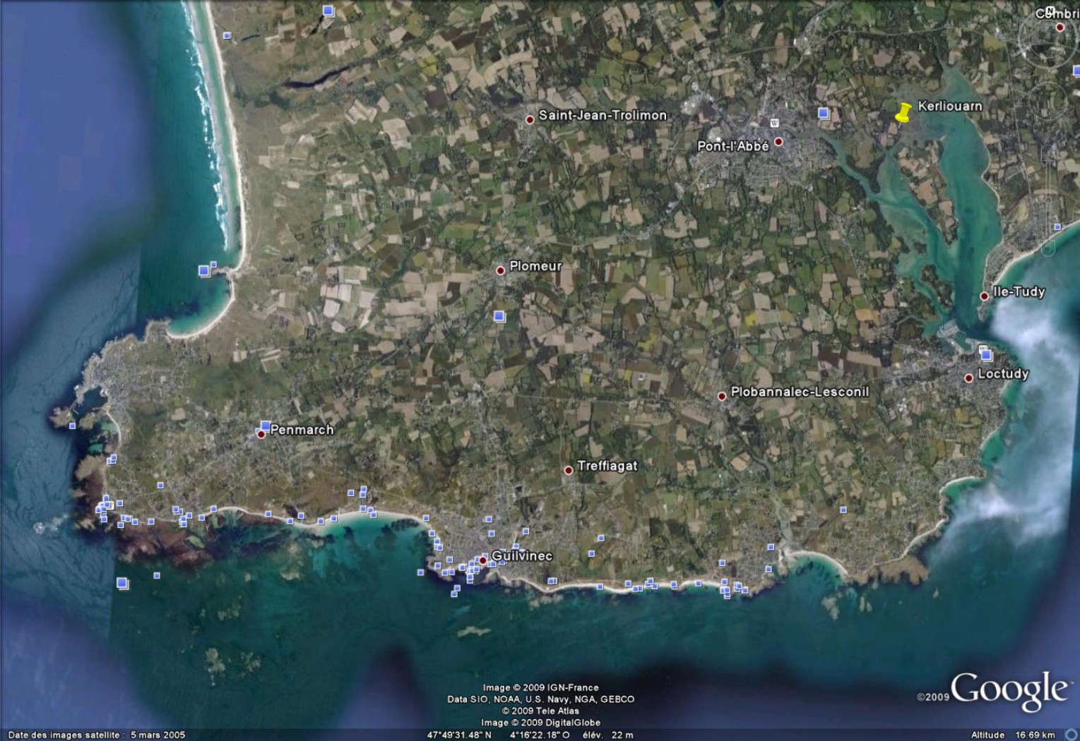 You are quite right, the general direction of America is to the left of the picture, but we are hiding from the full force of the ocean and west winds behind a small island. Here is a larger view with my place (Kerliouarn) and the harbour in Loctudy where the boat in my avatar is moored. A few pics of what it looks like from ground level.
