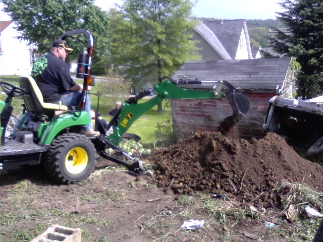 But before rain tried out the backhoe- first time and didnt pull machine over or smack anyone in head.:D I do have ? tho, the boom control seems really touchy and like twice as fast as the dipper /bucket control-is this normal? The guy in pic -Derek operates equipment and he even thought it seemed a bit fast or abrupt compared to the dipper end. any thoughts or is this normal-just need more time to get my muscle memory on that control. anyway dug out pretty good- sure beats a pick and shovel.