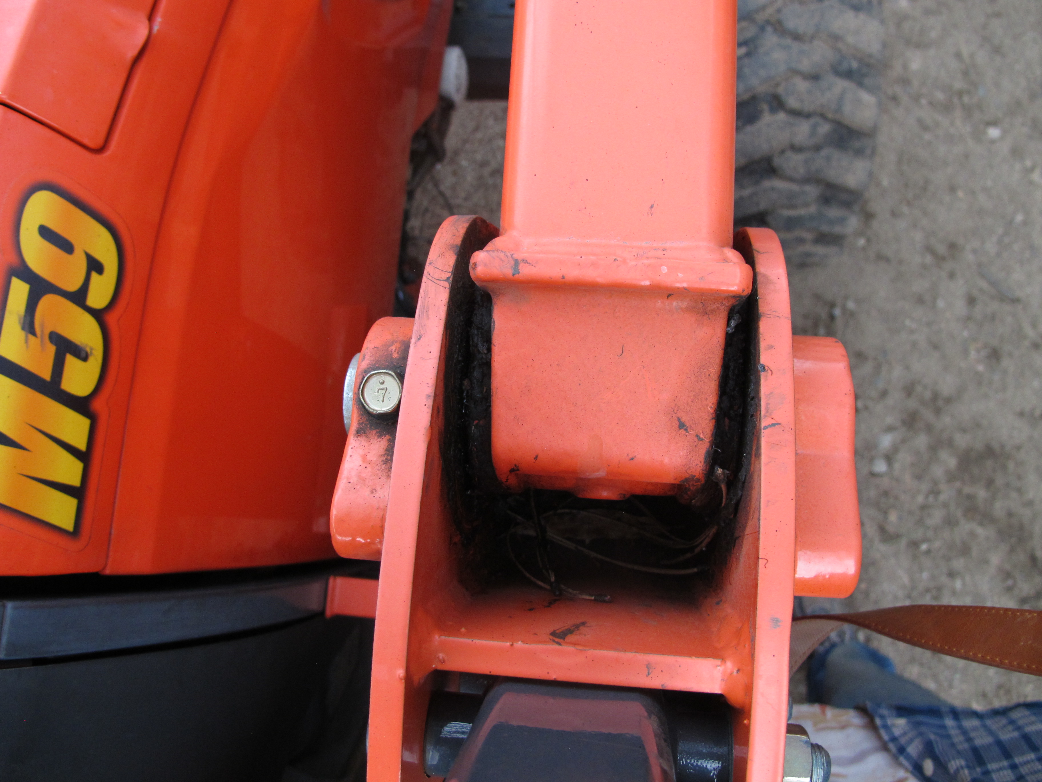 Which begs to ask just how much clearance there is between the loader frame ears and the moveable portion of the upper arm and or the weldment. Without pulling my loader again (no small feat on my large frame Kubota, I see to remember that the upper arm (a fabricated weldment) has a heavy walled tube welded into it. If the tube is too short (which creates excess space between the uprights and itself, that imparts what I would assume a failure load on the pin.
