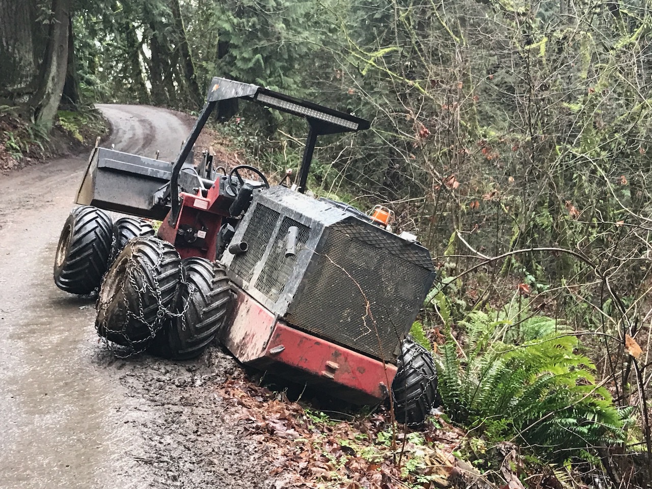 Well, it was completely stupid. Completely... I was putting gravel on the road, was backing up, looking over my shoulder going "fast" and out of the corner of my eye I see the wire loose on my lightbar. Well, like a woman in a diamond store I glommed onto that shiny thing and promptly drove the tractor off the edge of the road. It is super steep (photo does not do it justice). It took a moment to get the seat out of my crack, and then I did the walk of shame to the neighbors house and he brought his 3/4 ton with a winch and we had some fun pulling it out. We had to do 2 pulls, pulling from the front and back to get it up on the road. Fun times. But if I had been on a regular tractor I would have had a serious rollover.