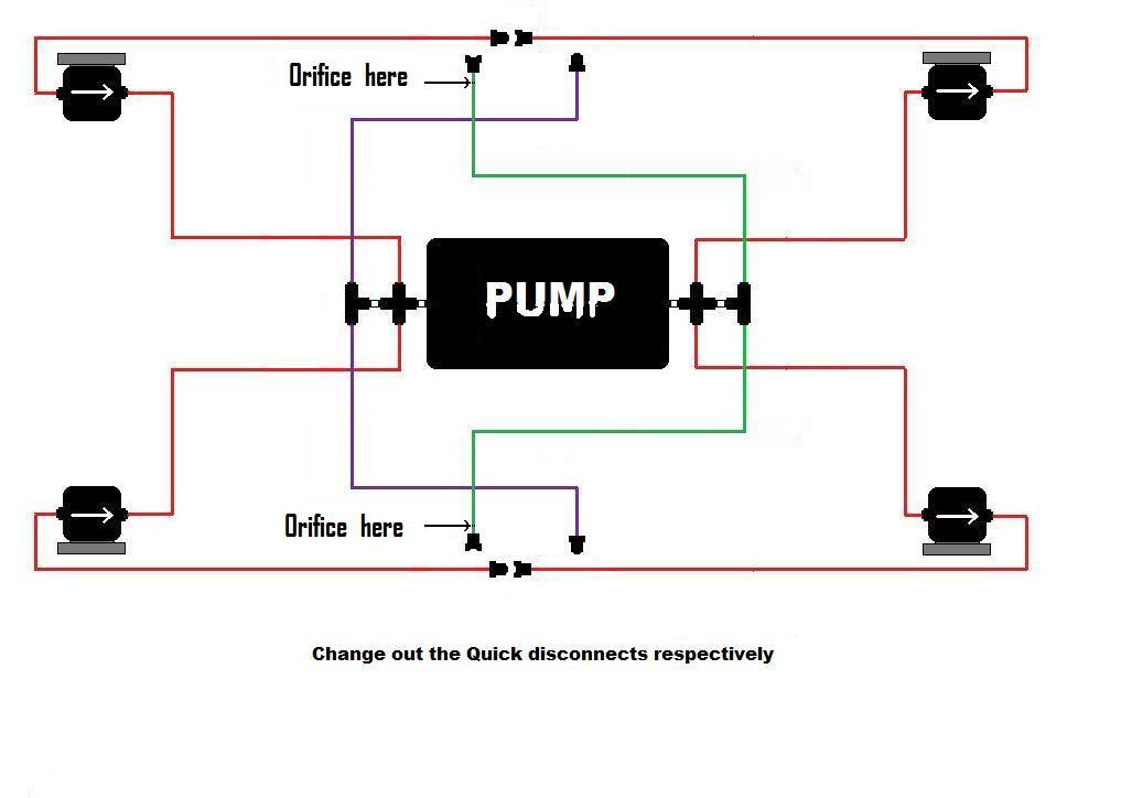 Ok guys, first I want to thank you all for helping me work through this. It has helped me to come up with a cheap fix for the spinning of the rear wheels. I will place a fixed orifice in the places indicated in the drawing. (Size of the orifice yet to be determined). This will allow only a limited amount of fluid t o go to the rear wheels and leave the desired torque to the front. So now if either one or both of the rear wheels loose traction the front would still pull. A pipe coupling just after the quick disconnect with a setscrew threaded into it will be very cheap and effective. I can then drill different size holes in the set screws until the best size orifice is found. Because hoses for the normal speed will not be used when operating in the original set up the orifices will not be a factor then. Now thoughts on this but please study the drawing. Come on guys it is a little work but I feel were getting close to coming up with a cheap fix for the PT痴 hill climbing ability. (Lack of that is)