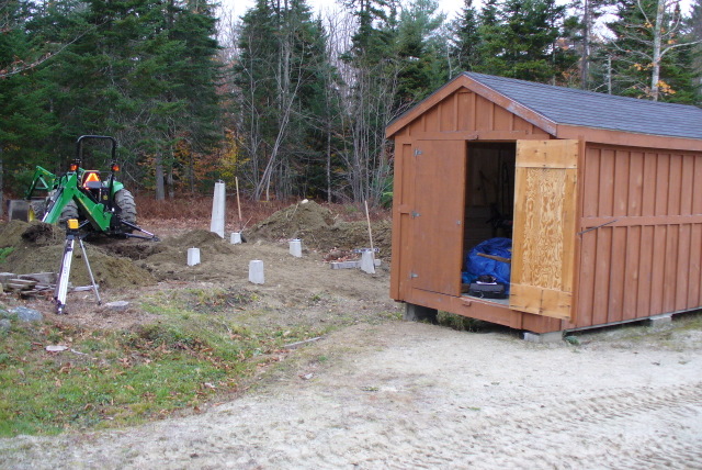 After clearing rocks and stumps, I set six four foot precast piers. They were tapered - 9" x 9" at the bottom and 6" x 6" at the top. I used gravel to bed them. I had a lot of water coming in the holes. I had to have a bucket load of gravel ready beside the hole I was digging. I shoveled in gravel 3 or 4 inches high, set the pier in, rocked it to work it down to the elevation I wanted, then tamped gravel around the base. I used my laser level and managed to get the elevations within about 1/8" of each other. The horizontal alignment was a bit more difficult. It took 3 or 4 tries on a couple of the piers to get them where I wanted them.