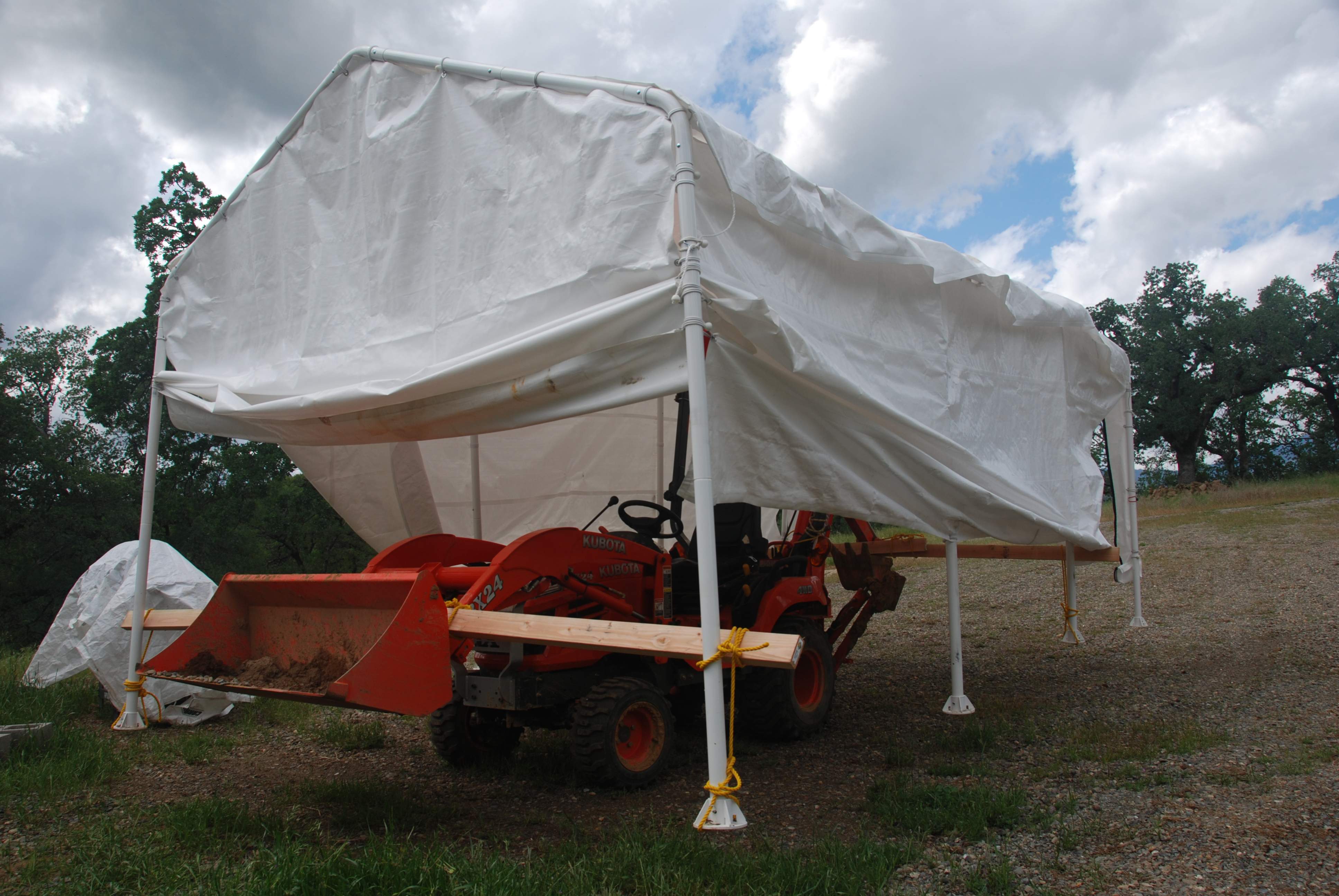 Inspired by a previous post about moving a shed with a tractor, I tried moving a carport tent with my bx24. Worked great and saved a lot of time compared to breaking it down and reassembling.