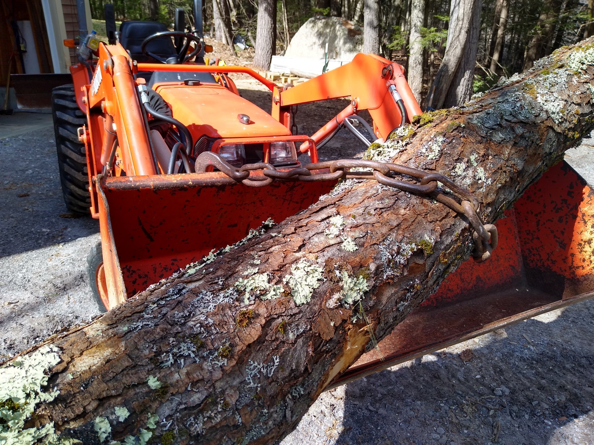 I have a Kubota B2710 which I love, but here's my problem. My logger dropped a grapple load of wood in front of my garage (the only place he could) so it's difficult to get the cars in/out, and it will be impossible to plow next year. It's at least 3 years worth of wood, so I need to move at least 2/3 of the pile before Fall. So far, I've been doing this by cutting each log in half and I chain each "half-log" to the bucket, and move it to the back yard where it's out of the way. This often involves climbing onto the wood pile to unhook the chains. As you can imagine, this is only marginally safer than Alaskan crab fishing.
