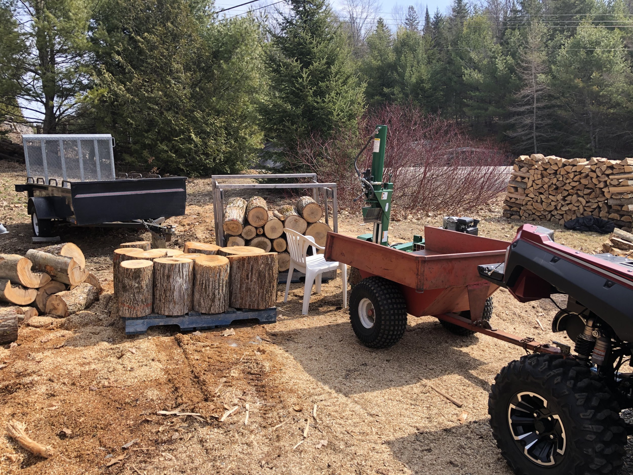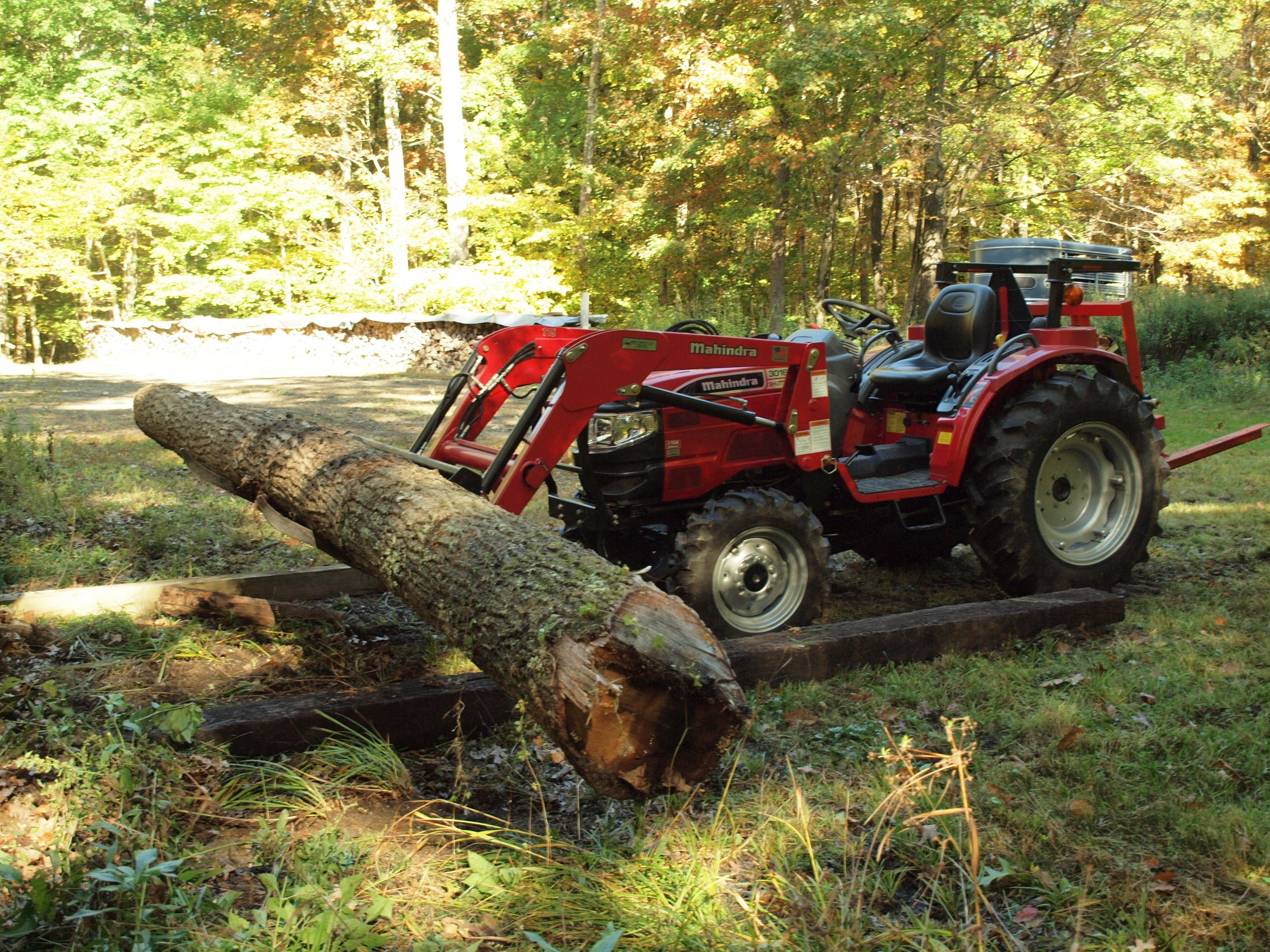 I use clamp on bucket forks. Works pretty well. If you get skillful enough, you might be able to poke the forks into your pile and snag a few logs without ever leaving your tractor seat. Getting on and off to chain up and un-chain logs sounds miserable, and rather dangerous.