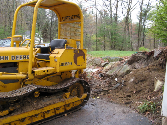 Just got done opening up a can of woop *** on those rocks. Pulled-em out like carrots out of a garden, we showed those rocks no mercy. Check out the picks, the equipment worked like a charm, see, I told the boss we could not live without a dozer. The average guy would've just left the perfectly good rock retaining wall that has worked fine for 9 years in place. But not us, good by rock wall and hello block retaining wall that will probably need annual maintenance, who said I don't know what I'm doin?