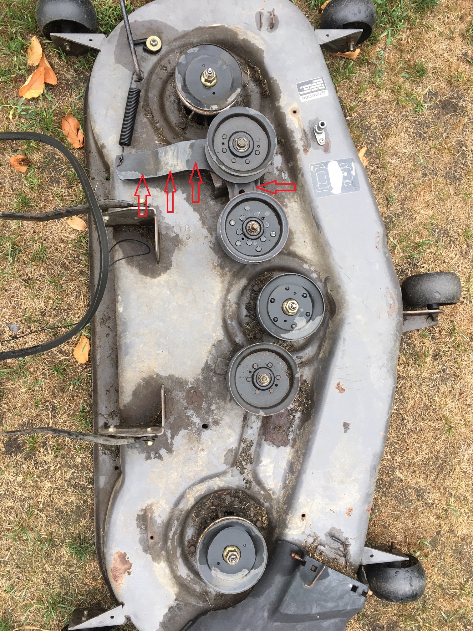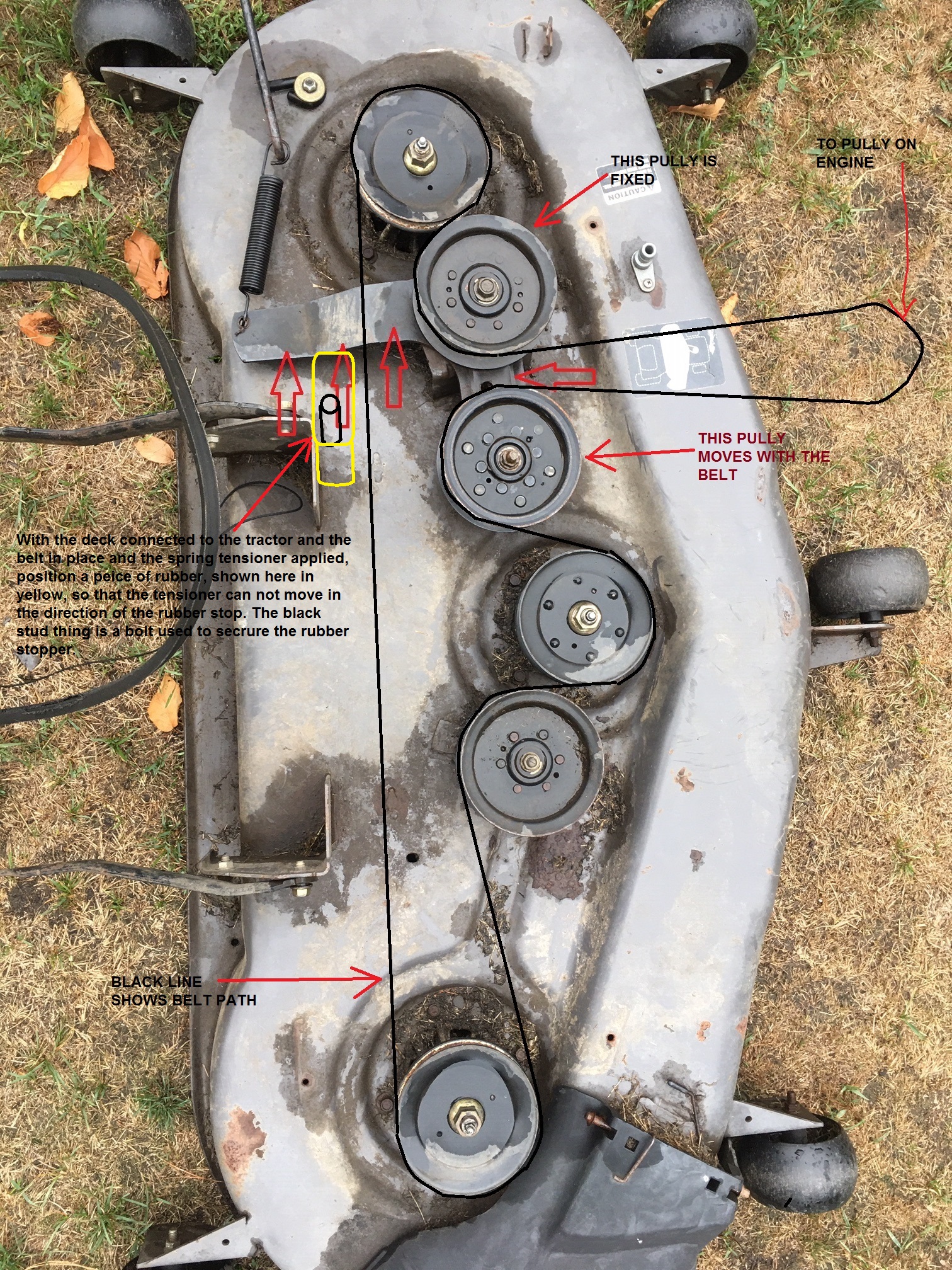 I had a lengthy post at the end of last season where the mower deck belt kept jumping. Lots of good inputs/questions around pulleys, tensioner, etc. and while I got all new spindles, a new tensioner, certainly new belt(s), I think the issue ended up being that the "pitch" of the deck was not correct. I know the front needs to be 1/8" to 1/2" lower than the rear and ...after addressing that, it seemed to work well. For a while.