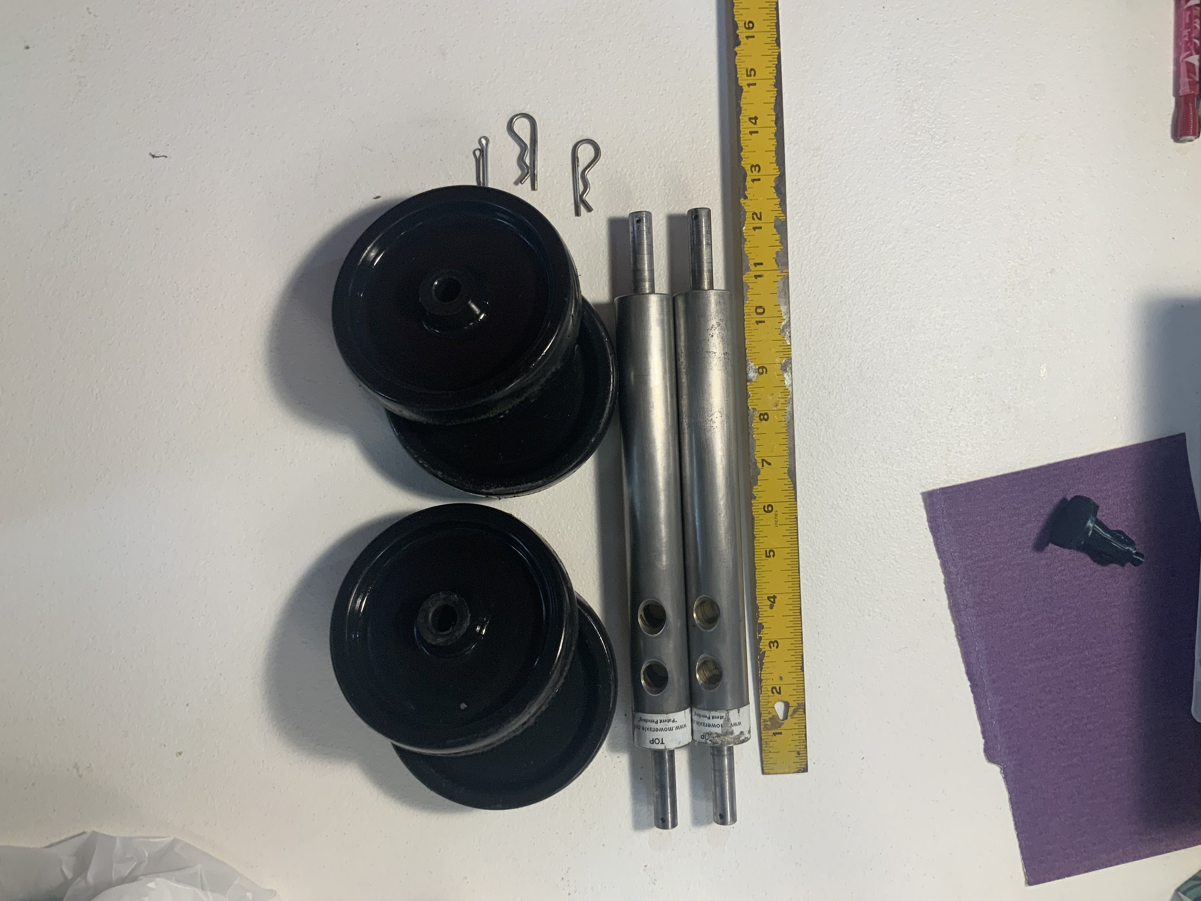 Heavy duty axles that allow storage of heavy mower deck in upright position to save space. Great for storage and maintenance. I used them for one season on kubota 60 inch deck that weighed 300 lbs. I sold the tractor and don’t need these. This freed up space in the garage so we could store the deck and both cars inside. I recommend these, very sturdy and a great *