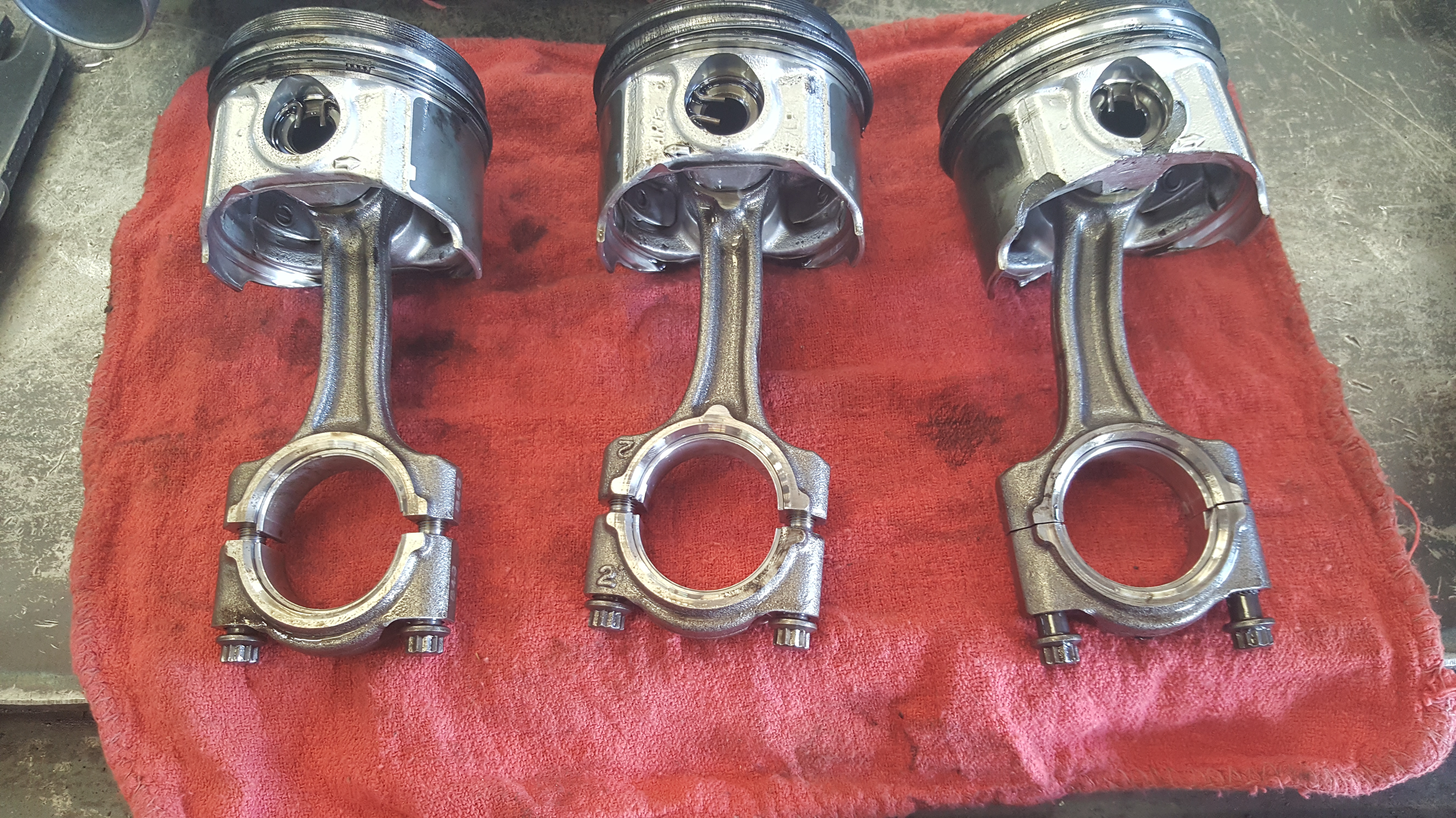If and when you turn one over. Don't try to start it without pulling the glow plugs before cranking over to pump out any engine oil that is likely in the cylinders. The picture is the result. This machine was practically brand new with only 9.5 hours on the clock. It bent all 3 connecting rods when it hydro-locked.