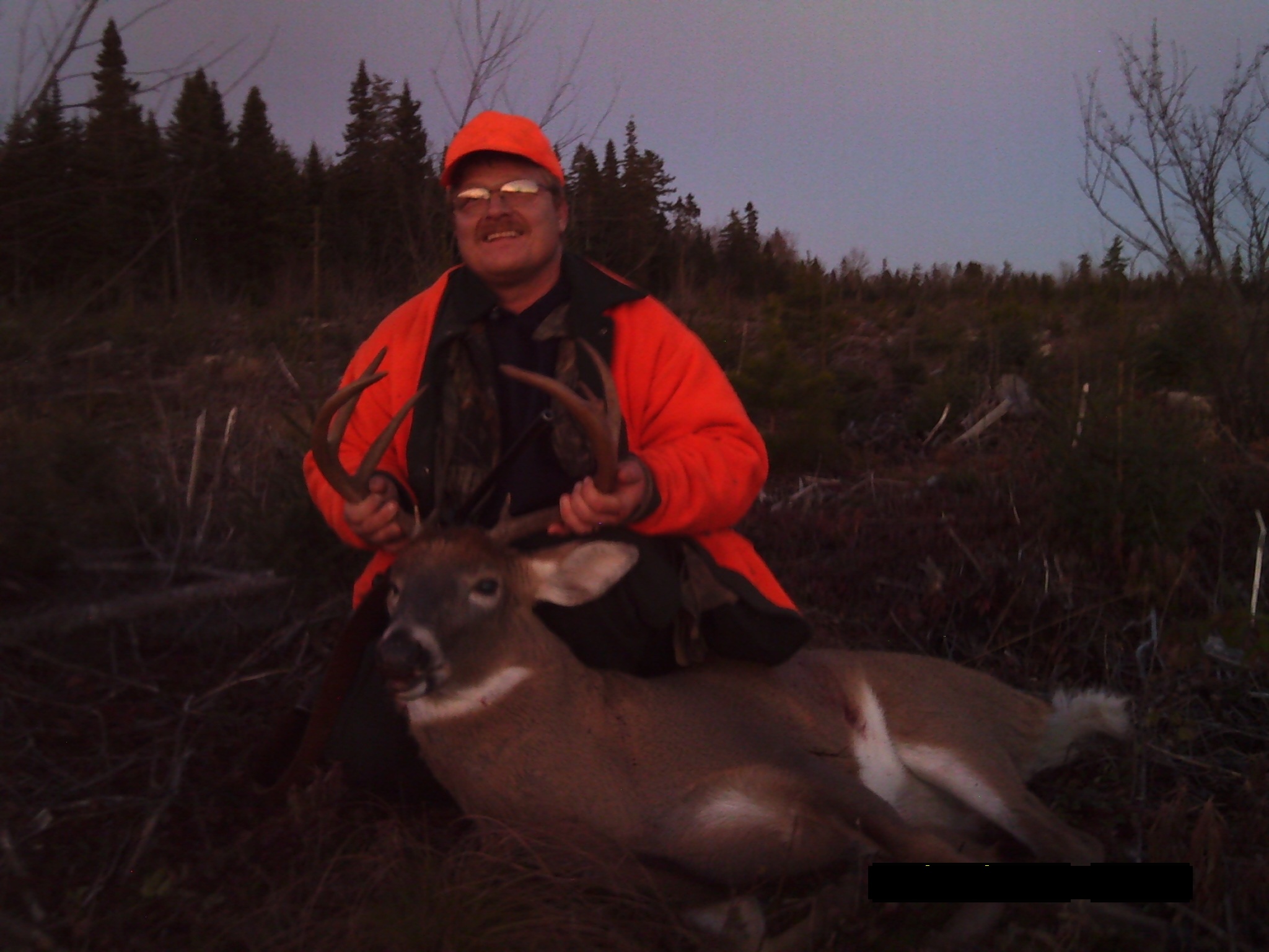 sorry I forgot to say how big.235 lbs 11 points.Has two small points right at the base of one tine.I was over looking a small chopping need to a peat moss bog.I could hear something walking across the bog then stopped .Then I could hear it urinating.I thought for sure it was the big moose hanging around .I got the camera ready to take pictures of the moose when this fella came out.It was him walking across the bog.What a hunt:thumbsup::thumbsup: