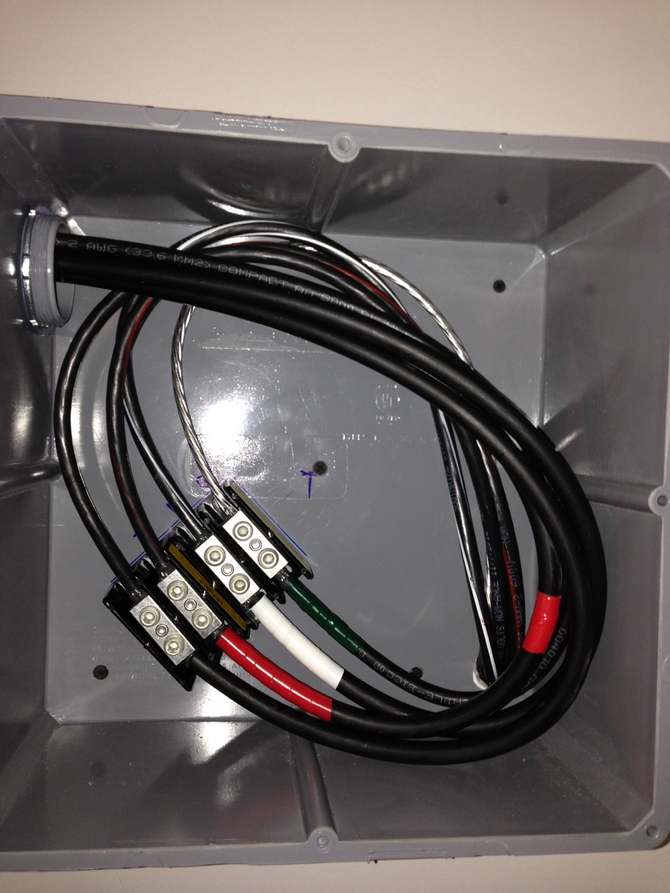 I had approximately 100 feet of distance from the generator shed to our main panel, where our electrician had wired us with an interlock and 100A breaker to backfeed into the panel. To keep the voltage drop down over this long run, I used 1/0 aluminum wire. Here's the junction where the 1/0 comes into the home and connects up to the 2-2-2-4 feeder wire that goes into the 100A interlock breaker in the main panel: