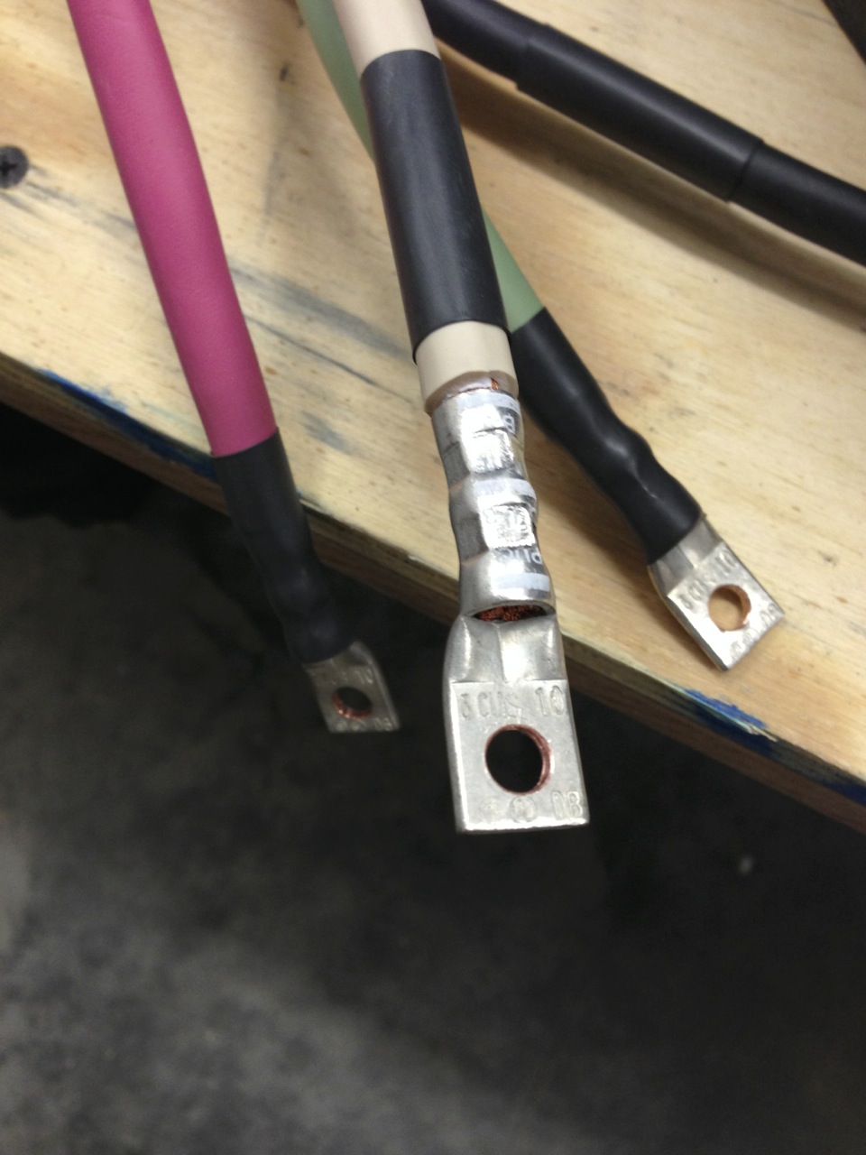 Connectors were "cold-weld" crimped onto this mining cable with a special hexagon crimp tool, which results in near-lossless connections. Similar crimps were used to transition the finely-stranded mining cable to coarse-stranded copper for the final run into the breaker panel in the shed (required because you cannot torque down finely-stranded copper in lugs):