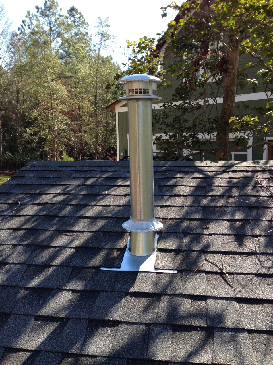 The generator has a vertical muffler, and I got a custom tailpipe mandrel-bent so that I could route the exhaust up through a chimney in the roof: