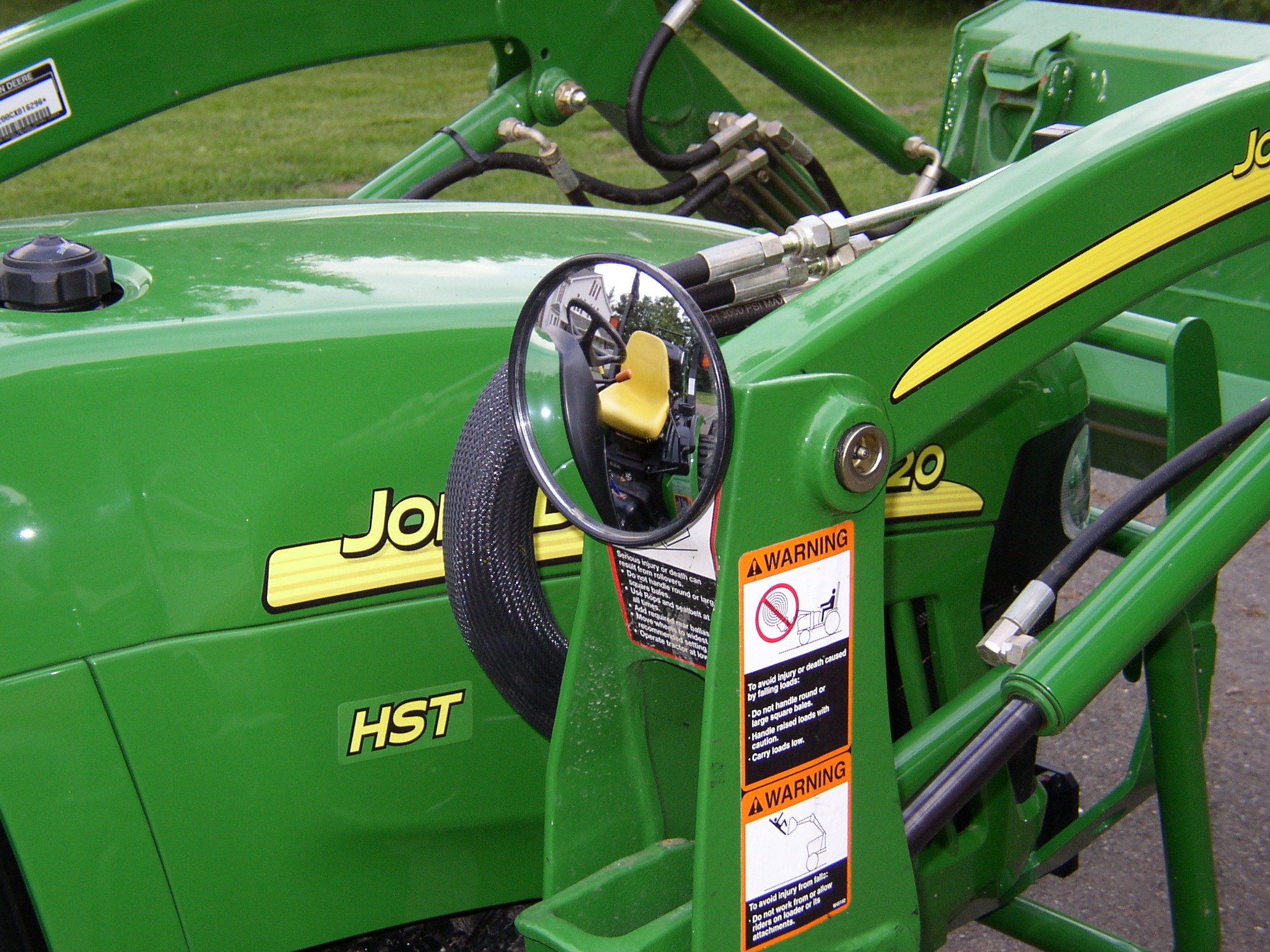 That's a nice collection of add-on improvements to your equipment. I made a rear-view mirror for my JD almost like yours, mounted on the loader post.