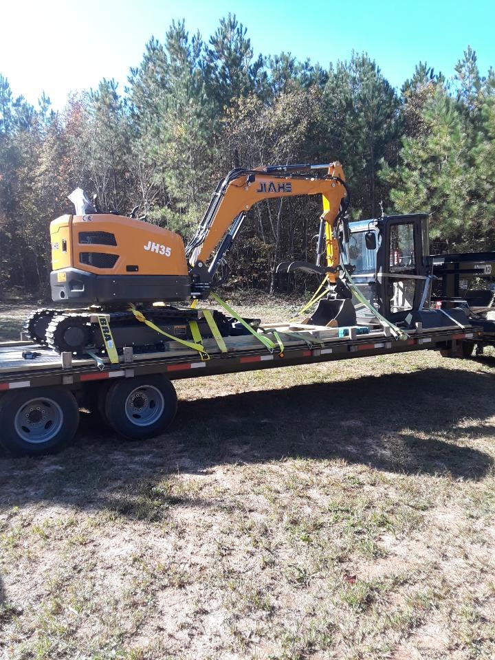 I get there and there it is inside the warehouse. The pallet has the rake and extra buckets. Another pallet is the cab. A box with a bunch of extra fuel and oil filters, small tool box, and 6 extra bucket pins, and 4 free "Jiahe" shirts. It would not fit in the container if the cab was installed. They sent me a video of how to install the cab. A couple electric connecters, and two ducts, and four bolts hold it down.