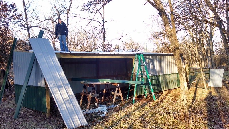 I got the trim around the garage door opening finished this week. It was a bear trying to fine-trim the metal panels so the J-trim would fit. That was my last piece of trim on the project which I had put off for over a month. With the cold weather moving in, I wanted to get it buttoned up to keep bugs/mice out. The other morning I discovered that a bird had worked its way in evidently, and of all kinds it was a wood pecker. He had been flying around in a stupor in th dark all night crapping on things. My work bench, tractor hood, my Carhart coveralls, even my son's pedal tractor that Santa is giving him this year (its hinding in my loft).