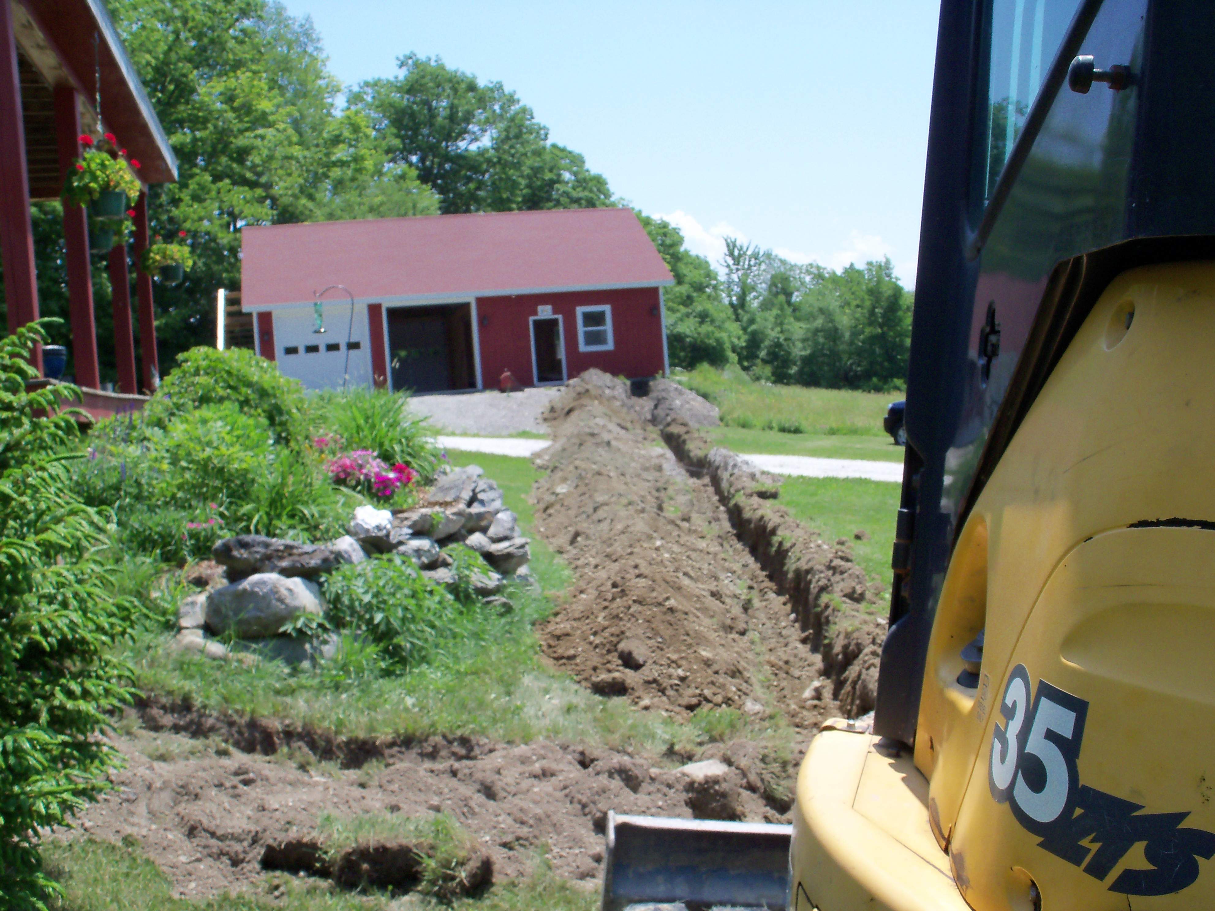 We finally got the trench dug and the supply line out to the barn ! I used a local contractor who did a great job and was very reasonable to dig the trench. It was about a 150 ft run, that we dug approx 2 ft deep. We layered the bottom of the trench with sand, ran the 2" conduit and wire, and then another layer of sand on top. All the digging along with two dump truck loads of sand was only $300.