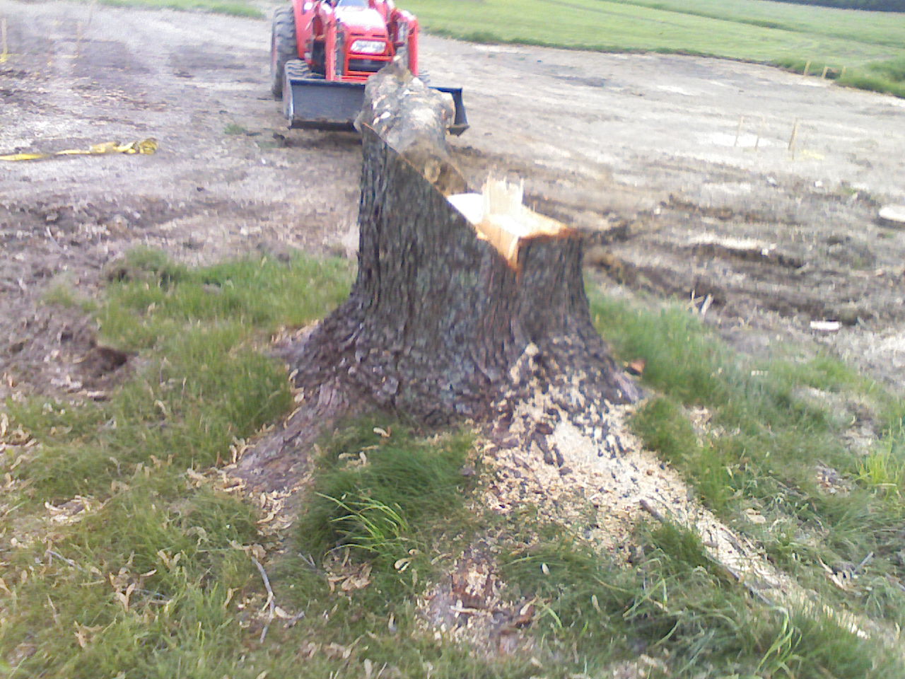 I had a big problem with this stump. It doesn't look that big in these pictures, but it took my tractor and a skidsteer to push it out of the hole and further back onto the property. The skidsteer pushed it straight, and I came in on an angle to help spin it. Between the two of us, and about an hour, we managed to move it about 100feet or so. At least its out of the way. The scariest time came when we went to flip it over, the skidsteer stalled as we wer at the tipping point. It started picking my whole tractor up off the ground (to be read all four wheels, tractor (filled rears) and a weighted down BB). Luckily he got his bucket going again, or I probably wouldn't be here now. After about 2-3 days of picking at the root base with the tooth bar to get the compacted shale and clay out of the stump, I was able to move it solo to the now old foundation hole, and punched it in there. The bracket you see is bent too badly to use again, it was on a 10000 pound line when I went to pull the actual tree across the field.