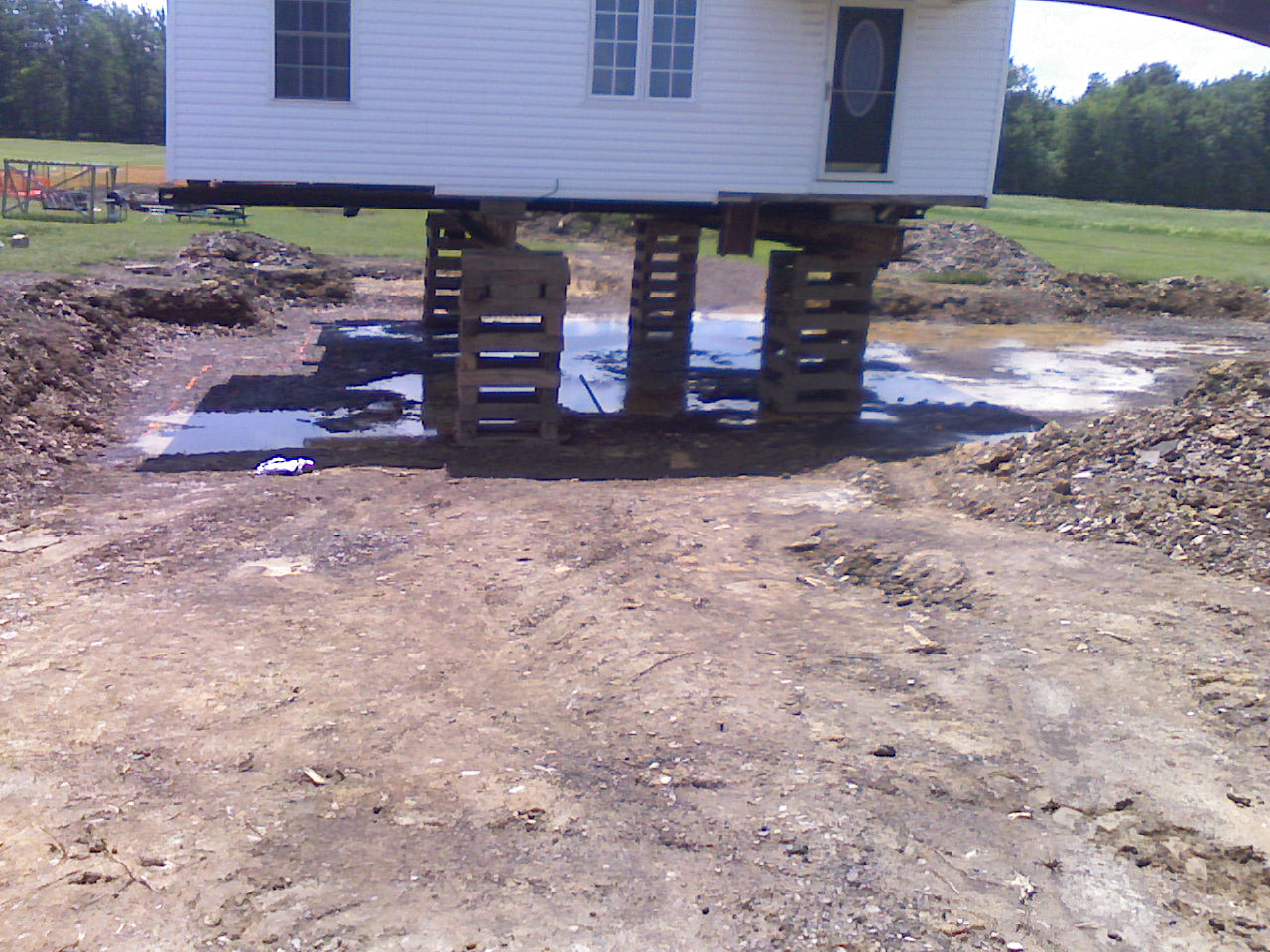 Here is a pic of what a house looks like with no basement, on steel ibeams, 9'4" in the air, sitting on cribbing (blocks of wood).