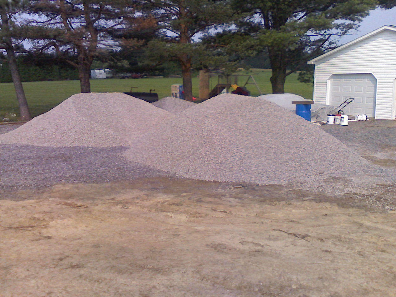 I just showed a picture of some of the gravel I moved with the DK45. Here you can see three triaxle loads of 2b limestone, approximately 70TON. I had to order another triaxle load for the concrete in the basement.