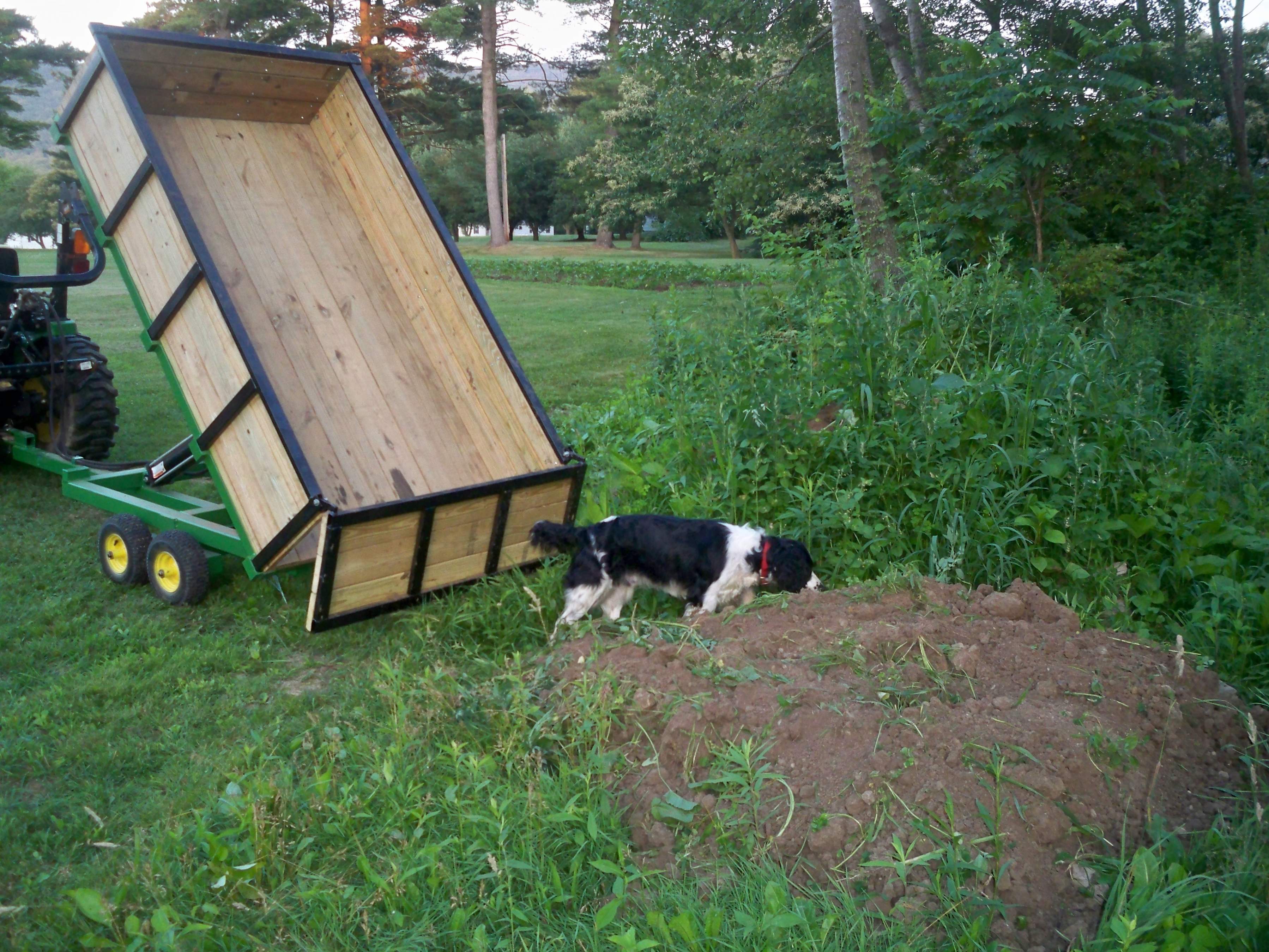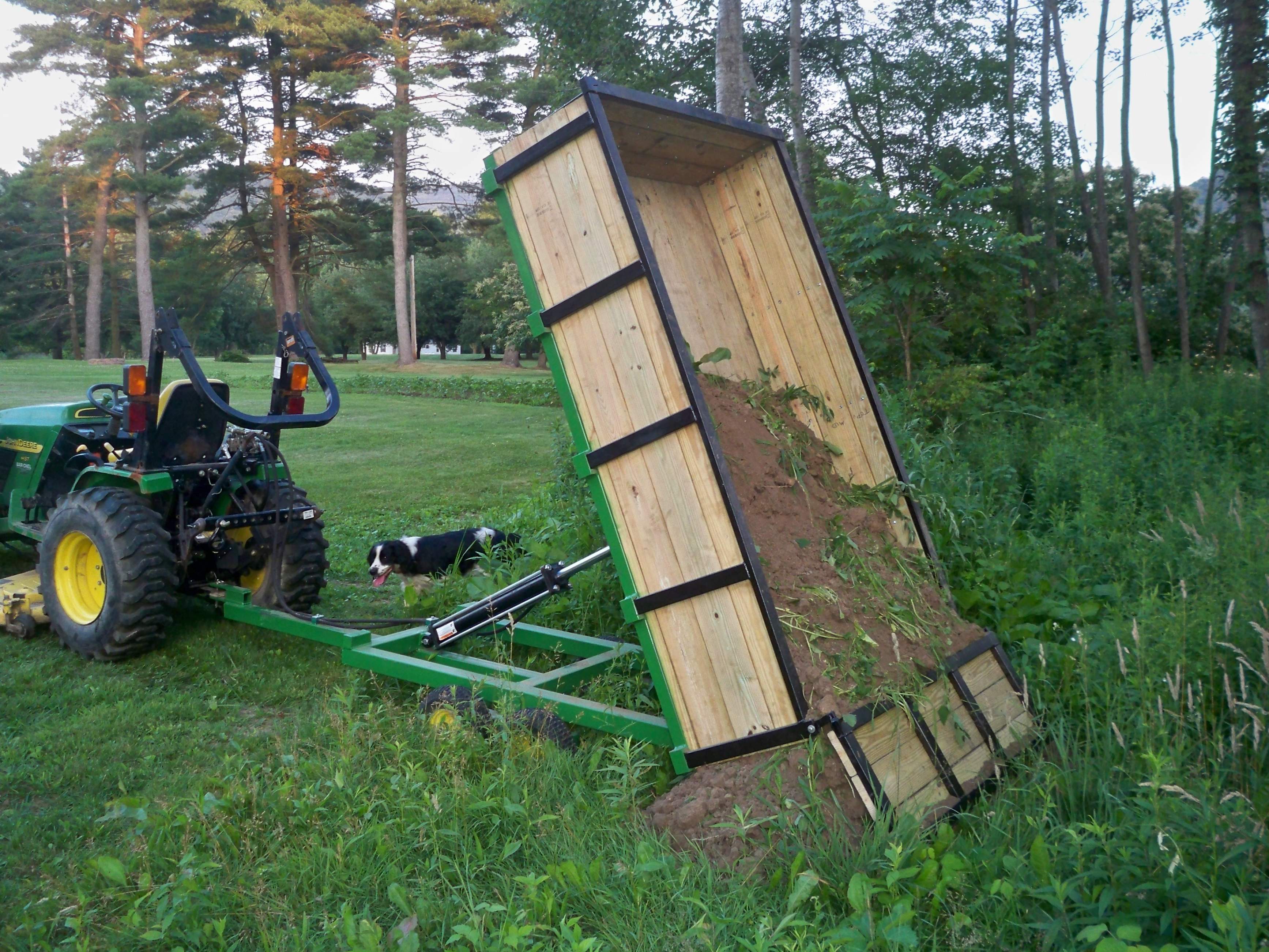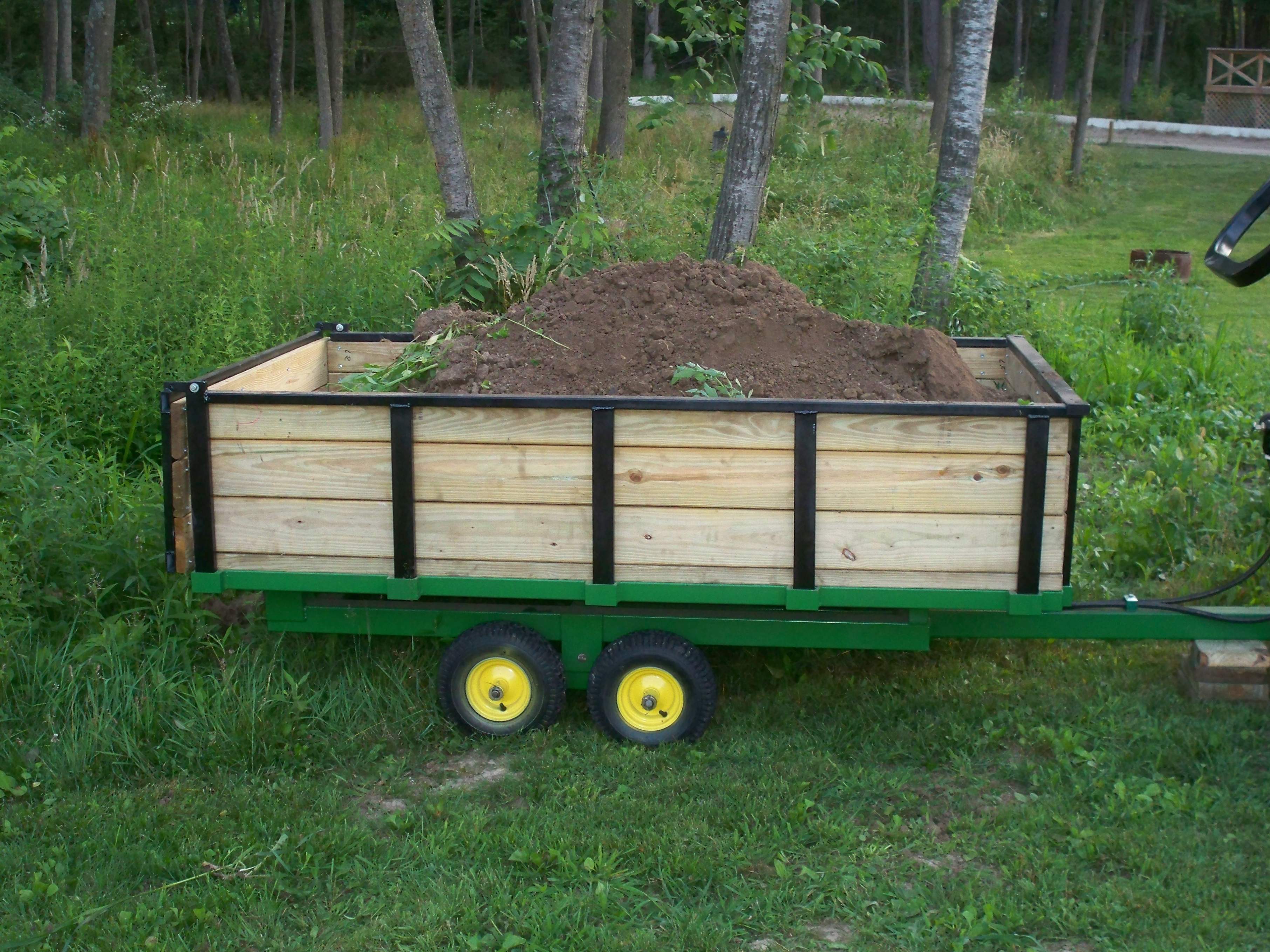 tried it, as you can see it has a pretty good load on it. it pulled around nicely but when i went to dump it i needed to actually help it get started. i think the cylinder is at too flat of an angle. it may be alright with a lighter load, i don't plan on loading it that heavy all the time. when i get the tail gate latch on it i will also be able to load it more towards the rear which should help a little to, not much, but maybe just enough. and of course, the dump angle is plenty and the load came right out even though it was just dry topsoil. overall, im still pretty happy with it, but if i were to go back and do it again, i would put bigger tires and axles on it, not only for the weight, but to also raise it up a bit off the ground so it makes a nicer pile, and i would also make the cylinder start angle a little steeper. its not perfect, but i'll get good use out of it. :thumbsup: