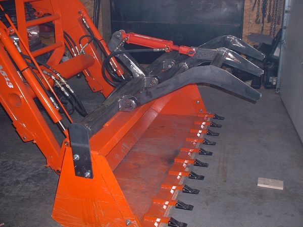 Yes, that was my original plan. I must have looked at that photo a million times and just could not get the design to work. Here's my theory, there are alot of factors that come into play here. 1) The depth & height of your bucket. 2) the design of your arms in relationship to your bucket size. 3) The degree of rollback that Kubota's larger loaders have is either 40 or 45 degrees, that's alot of rollback. I feel the downfall of my "L" shaped arms was the fact that they extended too far out in front of my bucket therefore I had to mount the cylinder farther back to accommodate my opening that I wanted to achieve. It didn't work out or else I gave up to quickly /forums/images/graemlins/confused.gif.
