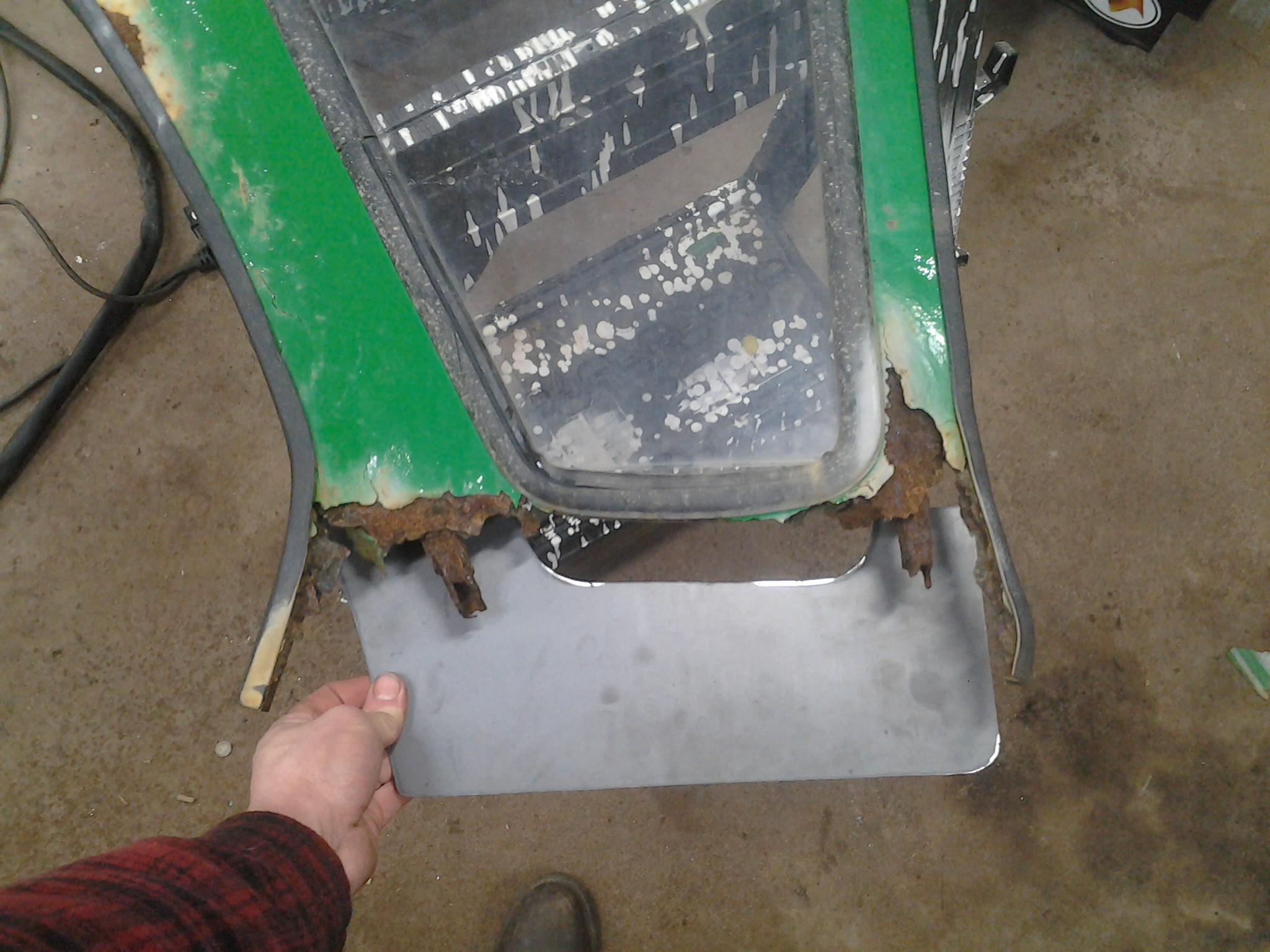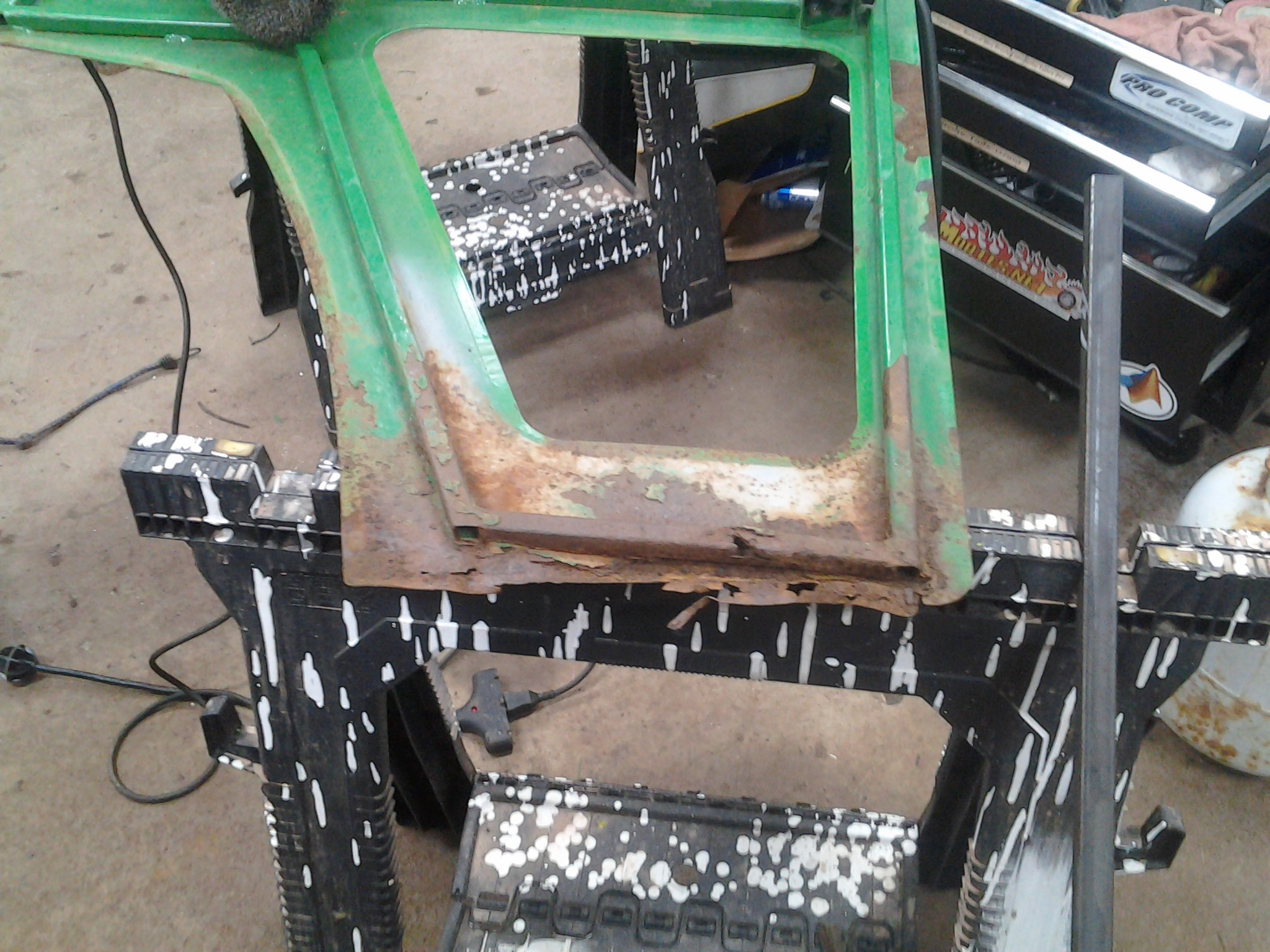 The cab had been "repaired" by someone before and had missing panel patches and frame parts welded in. For some reason they didn't put any paint on afterward so that's all starting to rust too. After seeing how rusty the cab is, I would NEVER buy a Curtis cab new if I was in the market and I could afford an alternative. It's a nice cab aside from the poor paint quality which allows water to get in a bubble the paint, trap moisture, and rust out fairly thick metal. The JD paint on the tractor is holding up just fine and protecting the JD metal.