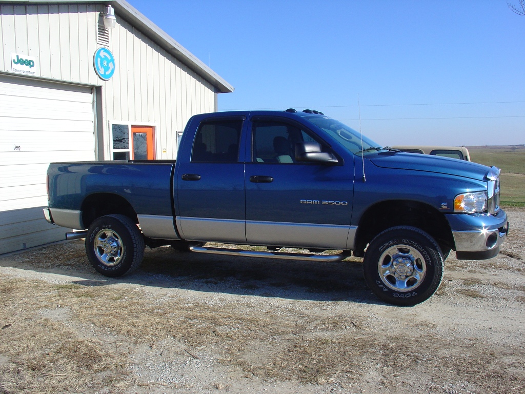 Here is a picture of my new to me 2004 Dodge Ram. Its a 3/4 ton, 305 hp 24 valve 5.9 Cummins. Its an automatic, 4.10 gears, has an Edge Chip and an Air Raid Jr. setup on it. It has also had some kind of exhaust work on it, but I'm not sure what kind. I also think, but I'm not sure, that it has a leveling kit. It has 106,000 miles on it, the interior is in great shape, the exterior is what I would call fair to good, it has a few battle scars. So far I've been happy with it, I've just put a few miles on it, but I'm getting around 20 mpg driving back and forth to work and such. I tried a couple of engine photos, but they came out blurry.
