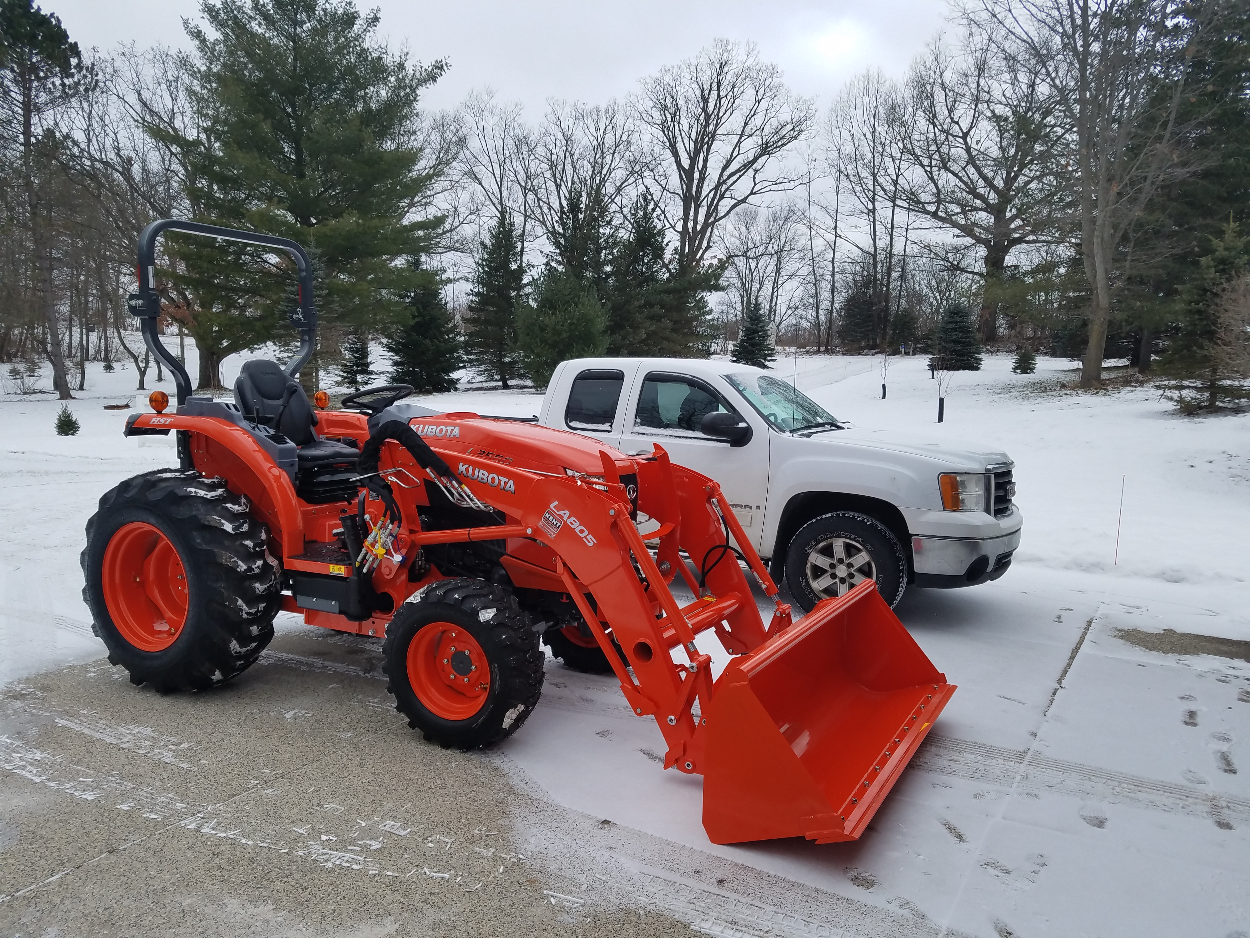 Santa was good to me. Friday a new shiny L3560 with LA805, heavy front bucket and block heater showed up in the driveway. He said due to weight he was a little behind with it, but it's okay. I've been planning this for over a year now, got my 10k equipment trailer last fall.......now on to attachments. I'm excited to join the club!