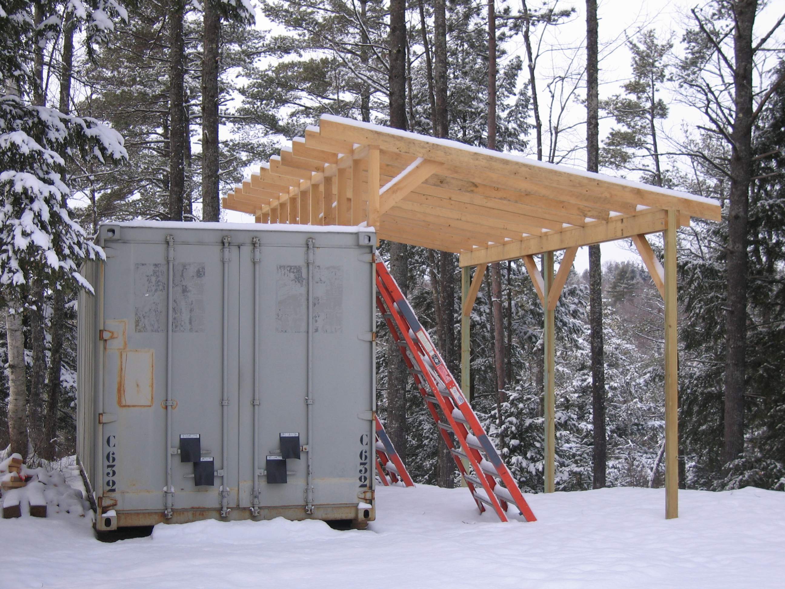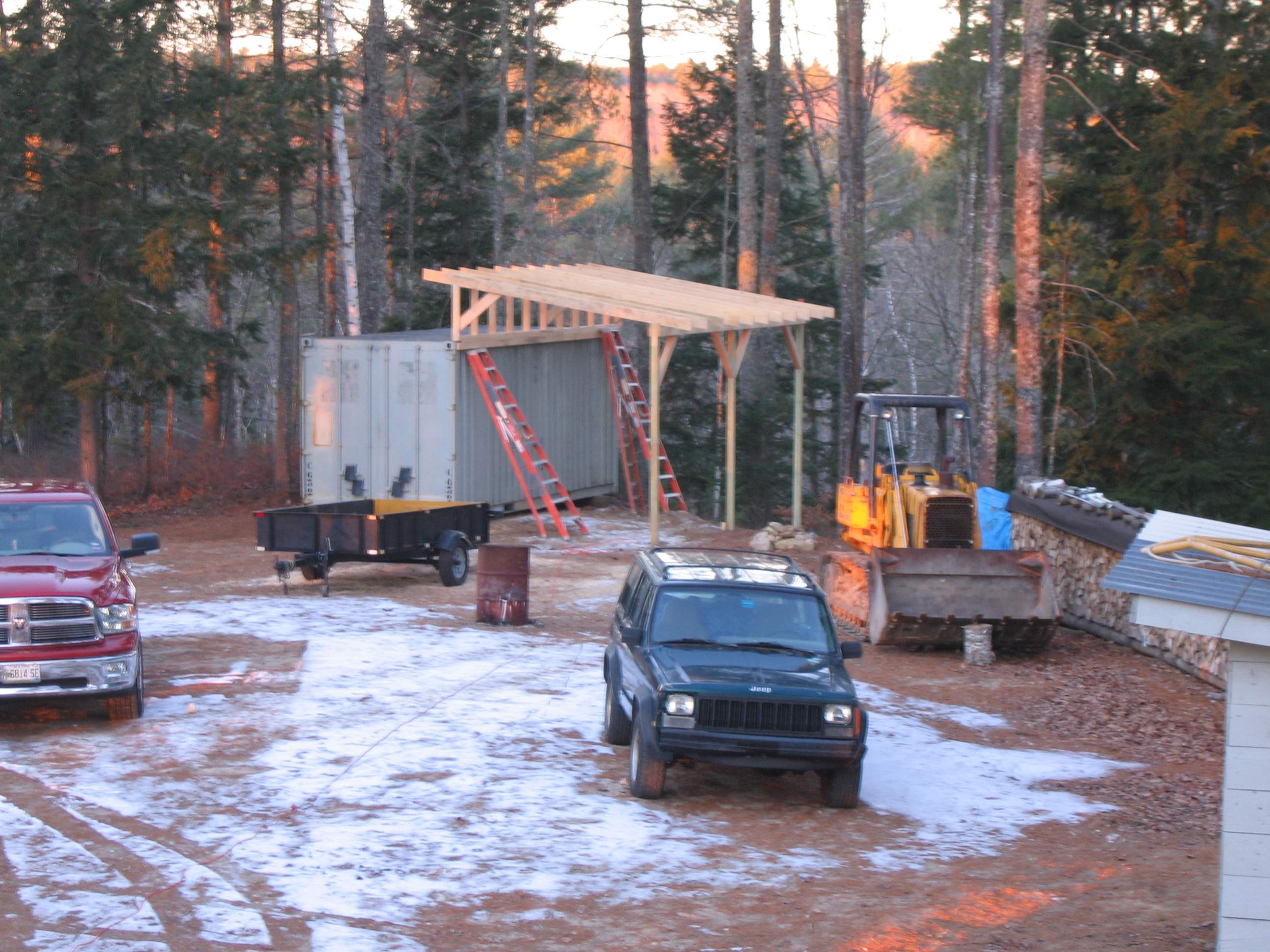 For me, I would have extended the rafters to centerline of the SeaCan and prepped the ends for adding a wing to the other side as you will surely need the space soon enough. This would also allow for storage of material on top of the SeaCan. No one ever has enough shed space. Cost would be minimal for the extra length. I like extra large eaves on my building of 16" rather than the standard 6-12 or less that most folks use. It seems to help in keeping more rain off the siding and gets the run off at the roof end further from the foundation.