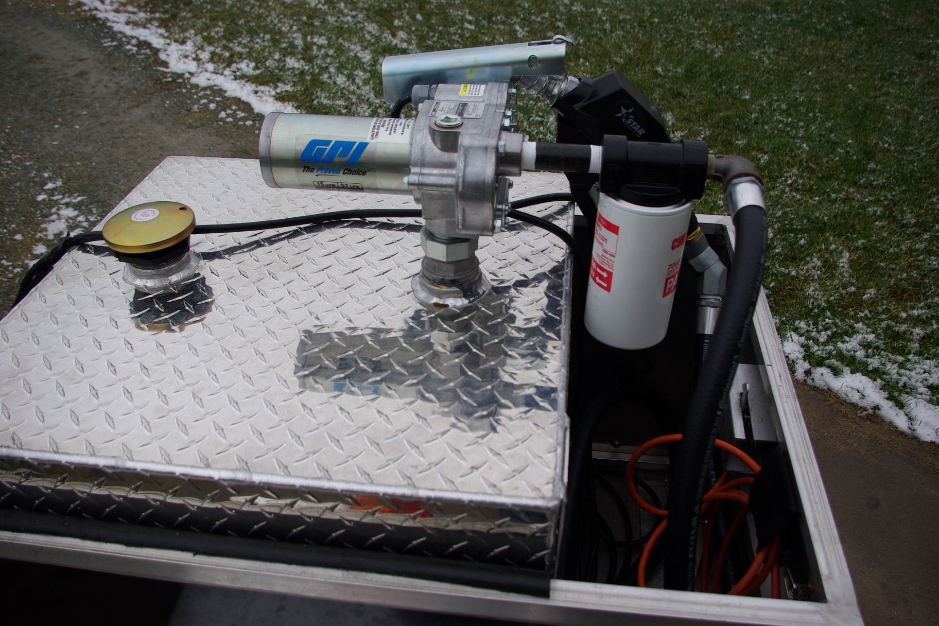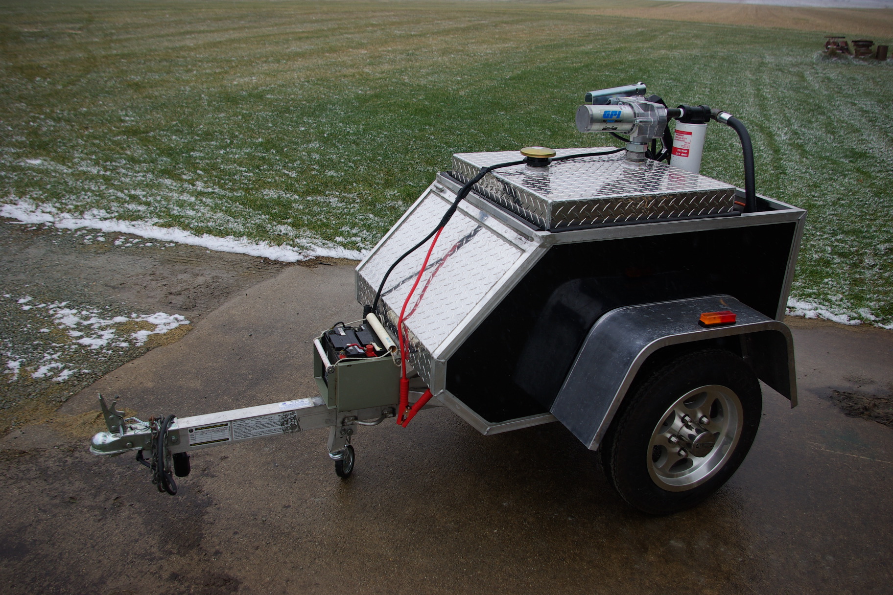 I put my transfer tank in a small 4x8 trailer.. that way when it needs fuel, I just hook it up to the truck and drive it down to the station. For a power sourc,I use a battery jump pack and the alligator clips right to the jumper cables. For the few times a year that I need to fill machines it is super easy and no aggrition with keeping a trickle charge on anything.
