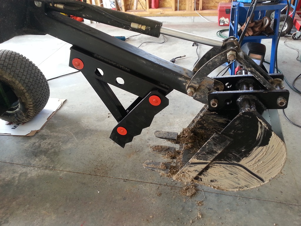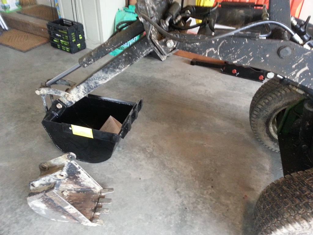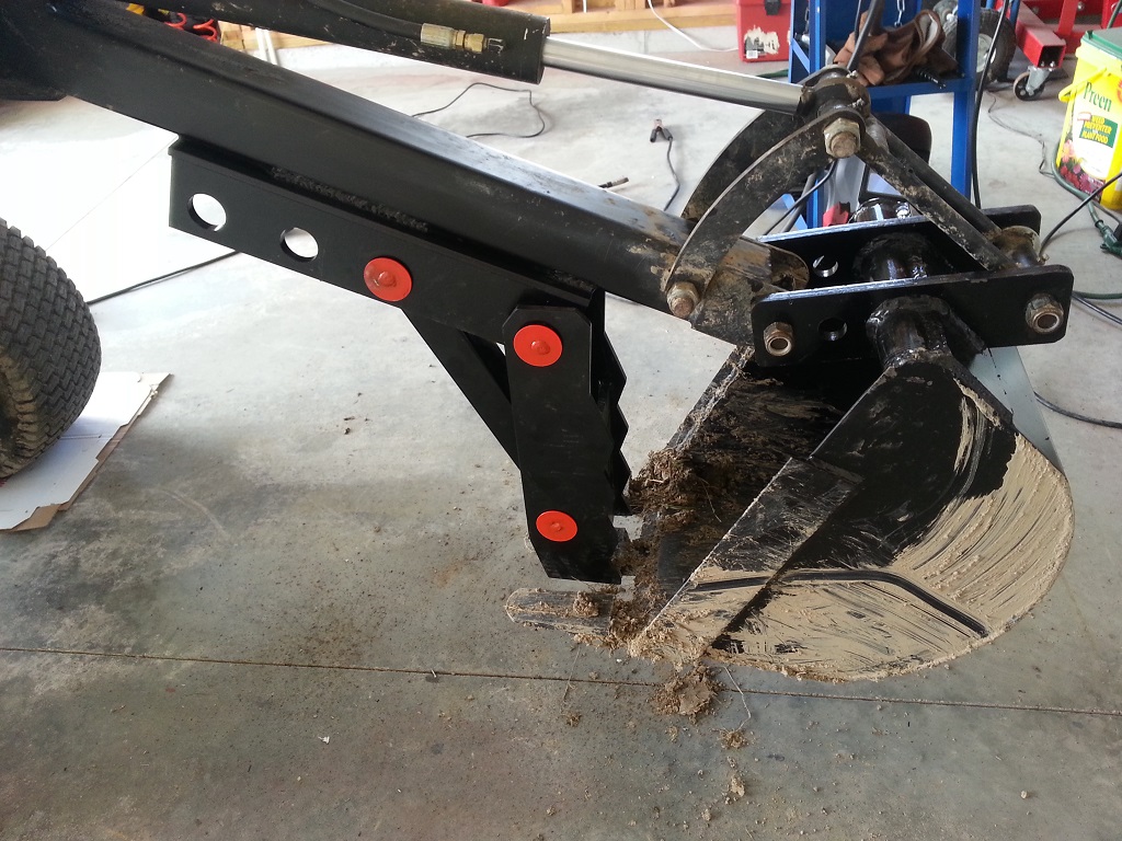 Replaced the original 9" bucket on the mini-hoe with a much larger 12" model with replaceable teeth. It cost me just over $200 shipped (with coupon) and required 4 large washers used as spacers when bolting it up. The mounting holes are about 4 1/4" apart on the new bucket, vs 4" on the old one, and the washer filled in the gaps. I plan to use it for digging in softer soil, or where it is wet/soggy since it can hold approx. 3x the material. The original will still be used for trenches and possibly when carrying heavier object with the thumb attachment.