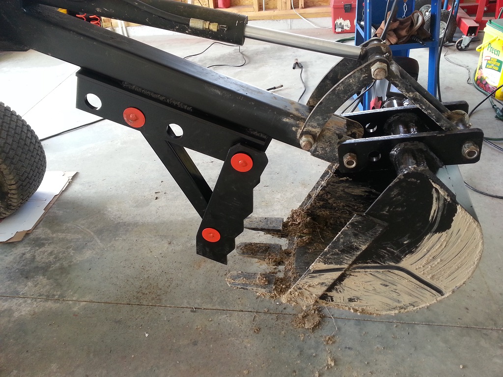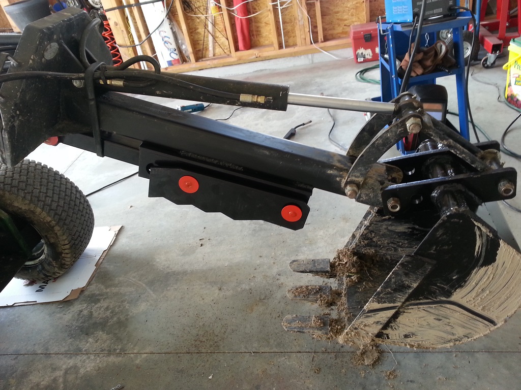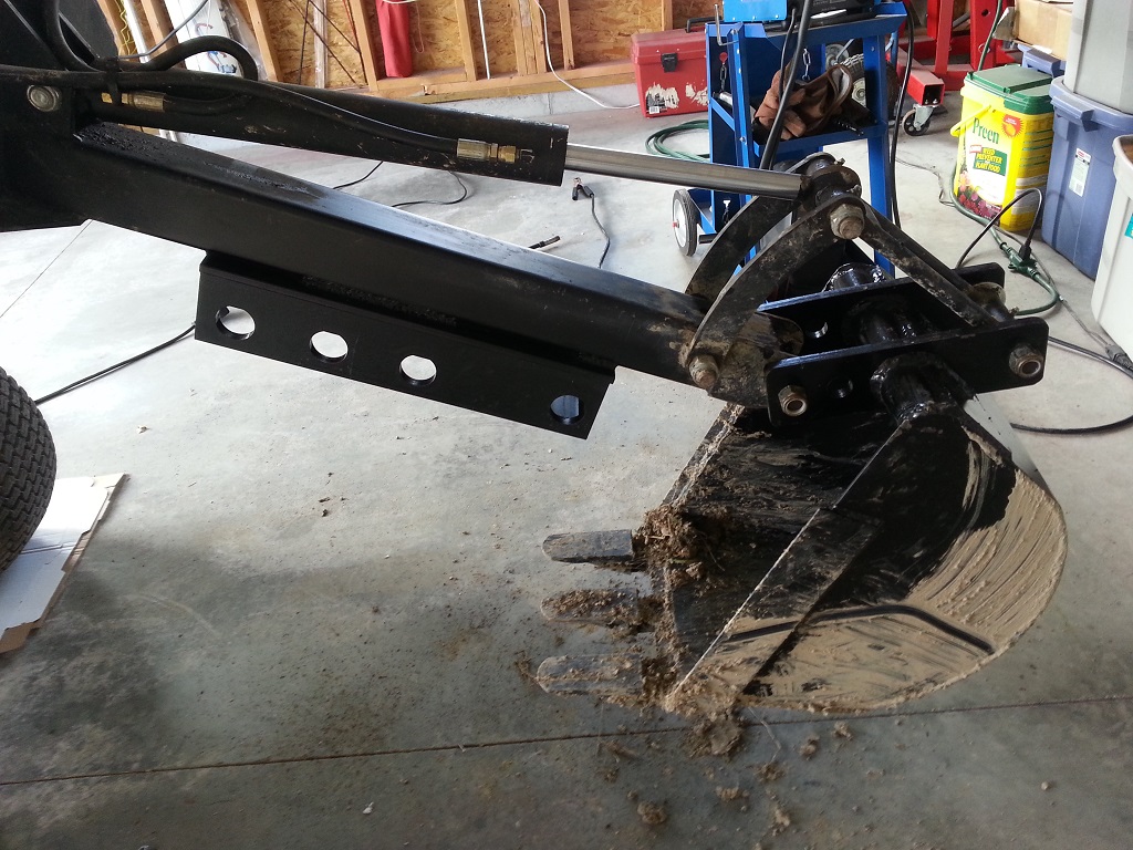 Bought a 16" thumb off of Ebay for $200 shipped. I could have gotten a different one a bit cheaper (~$38 or so), but this seller was highly rated. It is extremely well built. Really over built for what I need. The base is 1/2" steel and heavy. I mounted it such that it works best with both the new, larger bucket and the original PT buck. Pics are with the new HF bucket and shown in the different positions. I will most likely leave the base only when not using the thumb to avoid the added weight. The "pins" are enormous, and definitely will not the weak point. Picked up an old railroad tie and large rock as test, worked really well.