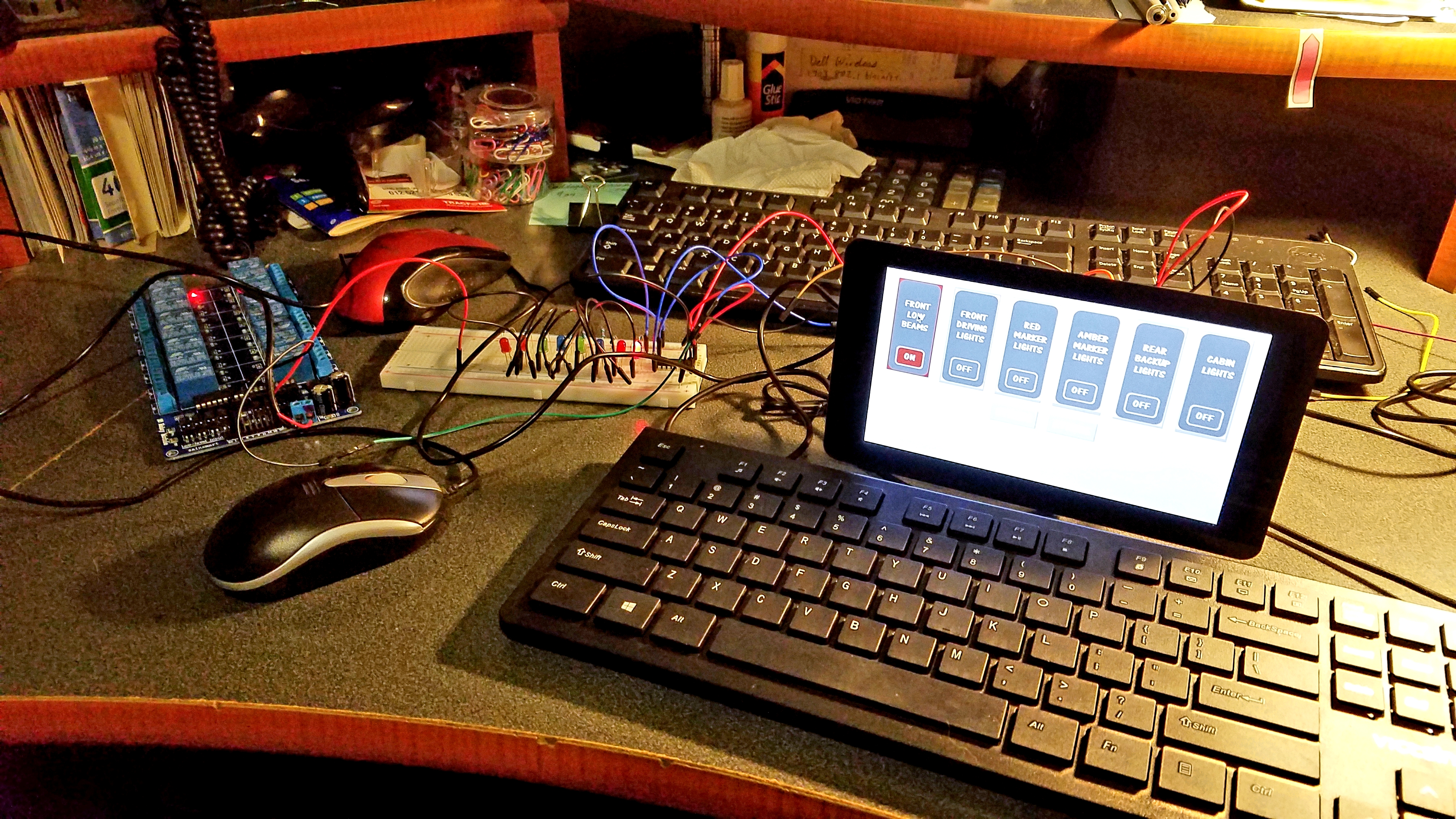 I got my touchscreen light control setup working in the lab. I plan to mount the display into the overhead dashboard. This display would allow me to control other items too like the wipers. I also started work on the two toolbox housings that straddle and close out the engine bay.