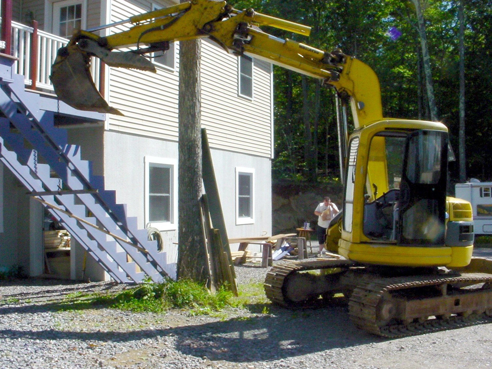 Finally we wiggled it out without too much damage, craning it with the L39's hoe, trying not pt bash up the garage door rails too bad.