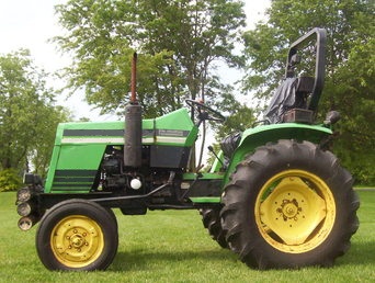 25 hp tractor that is painted to look like a john deere. it is actually a ^^^^^^^ runs great. has like new turf tires, loader, pto and lift. the bucket is 4 foot wide. the barrel mounted on the back was to offset the weight of the loader. the barrel can be easily removed