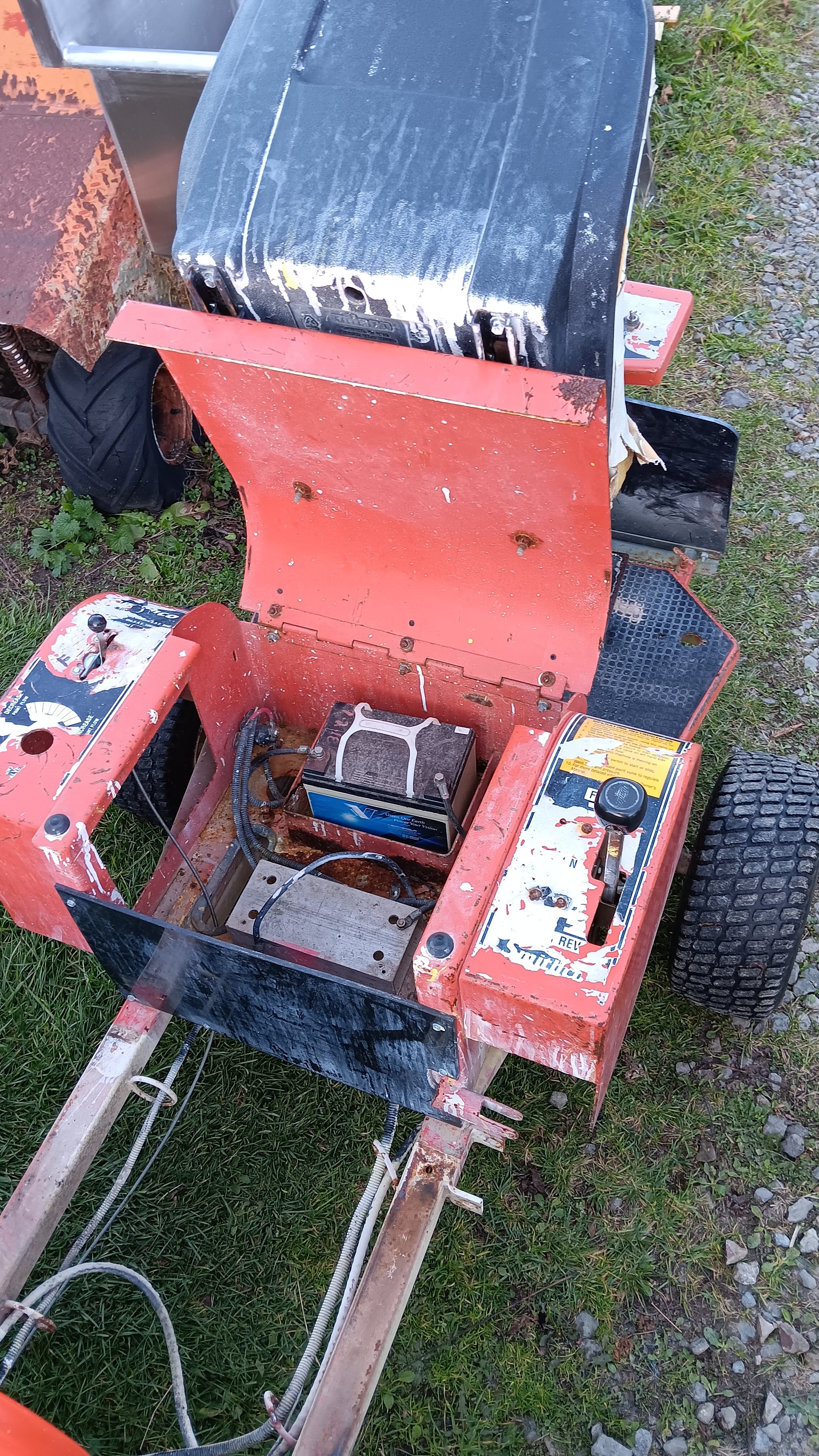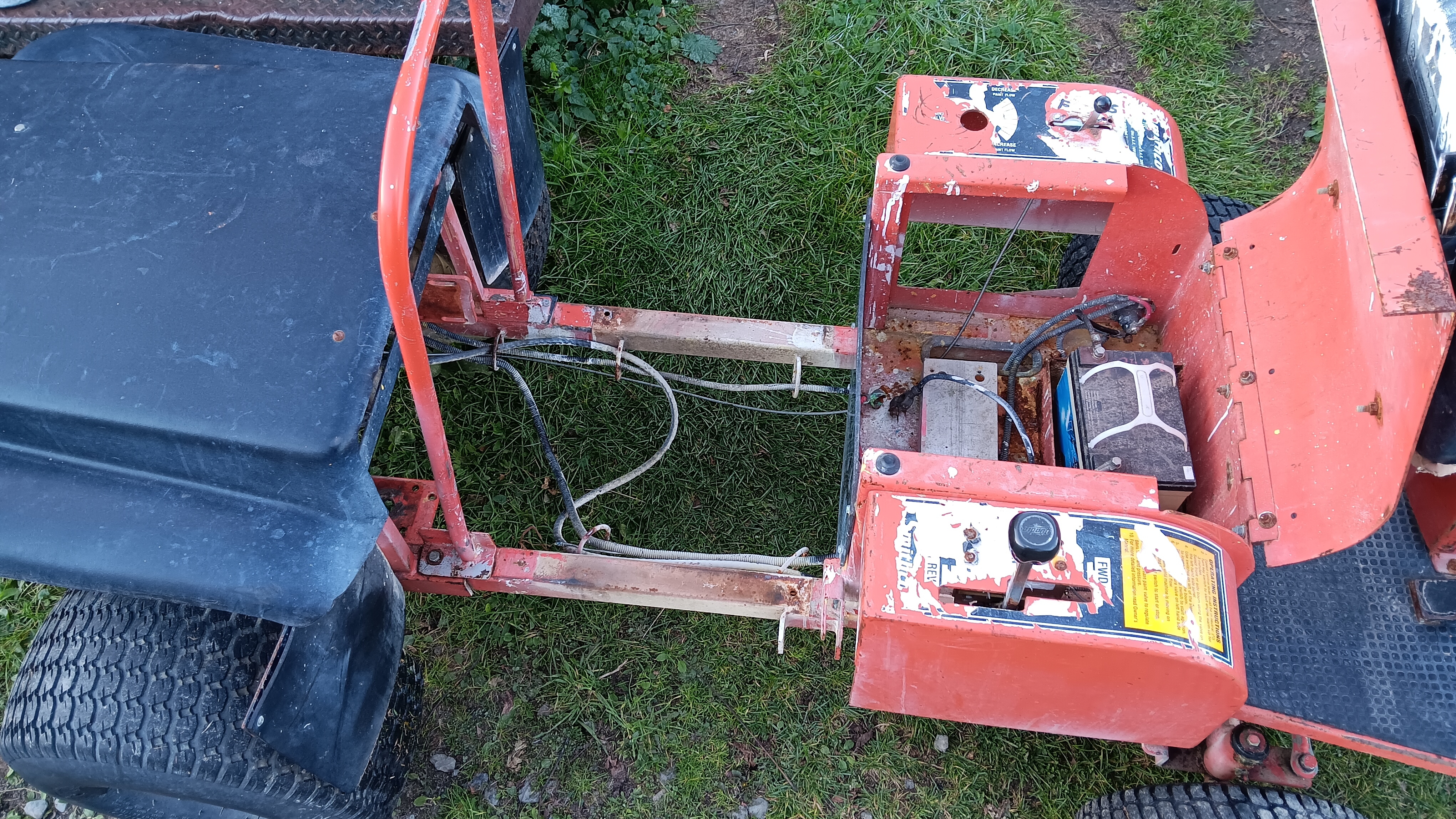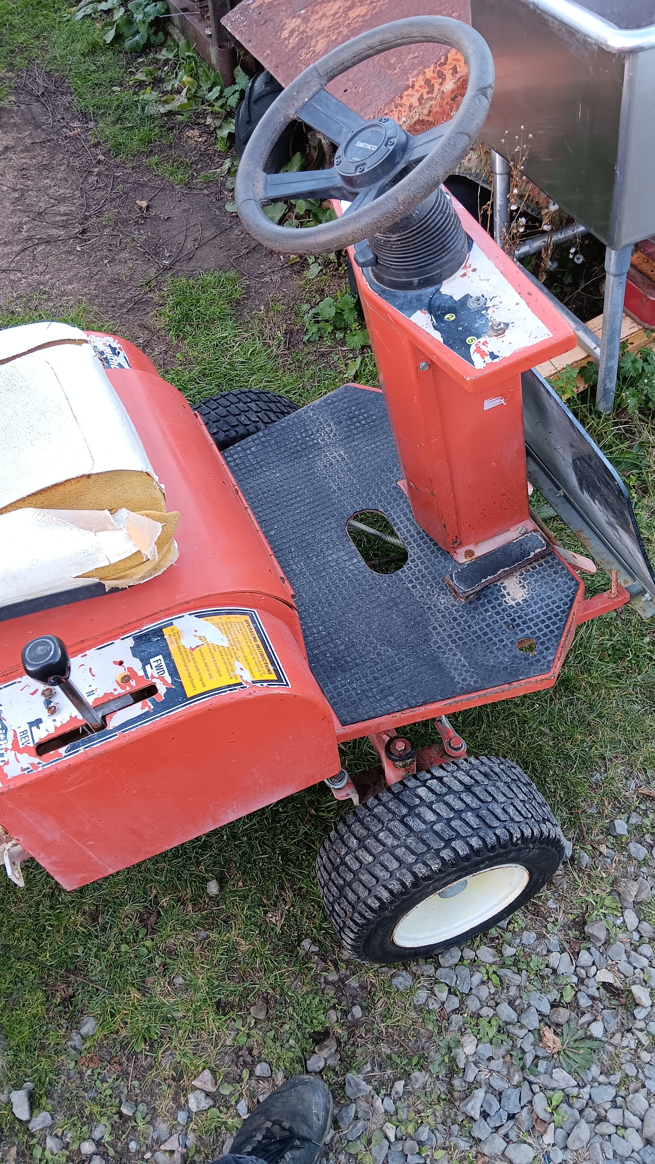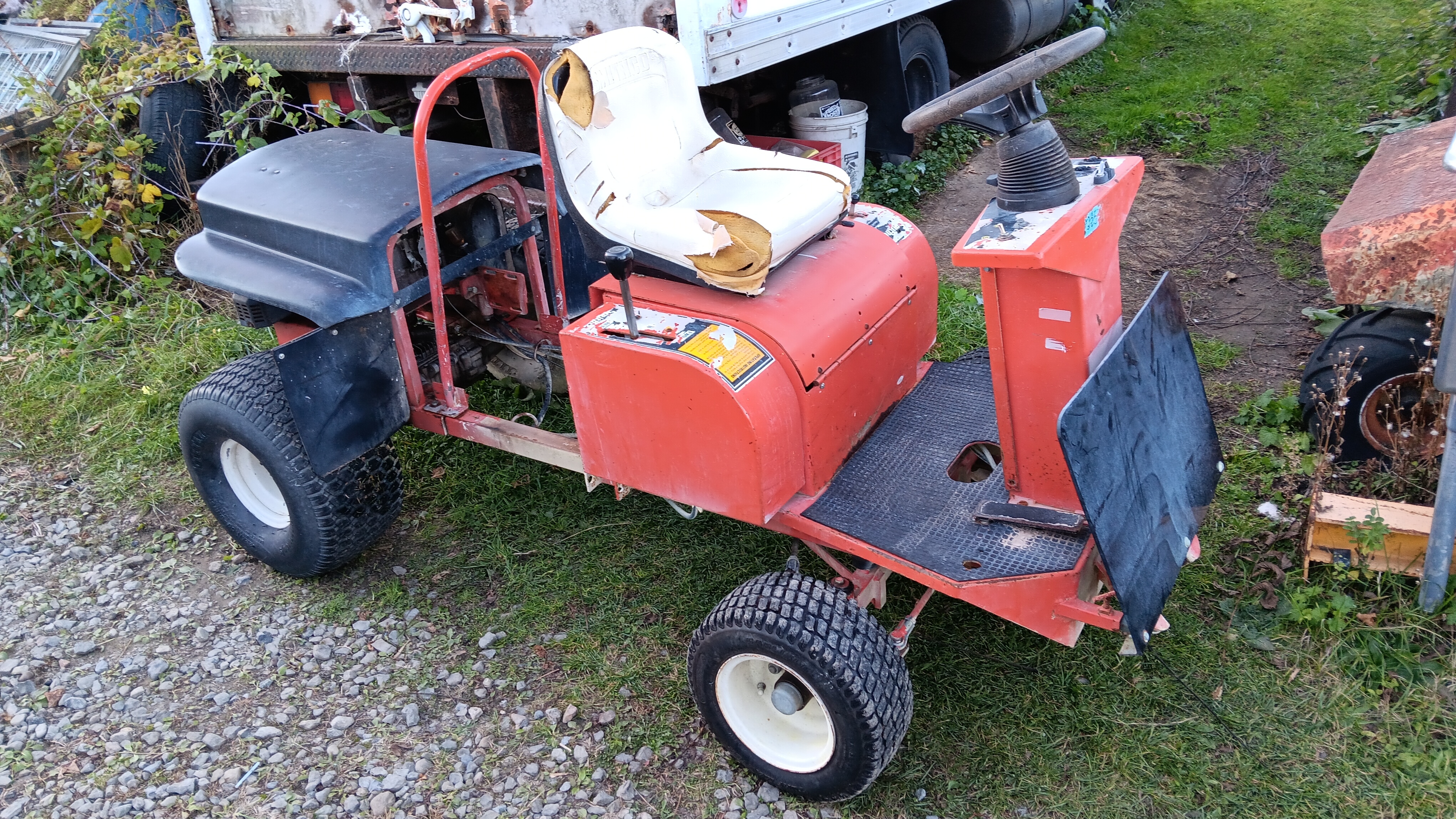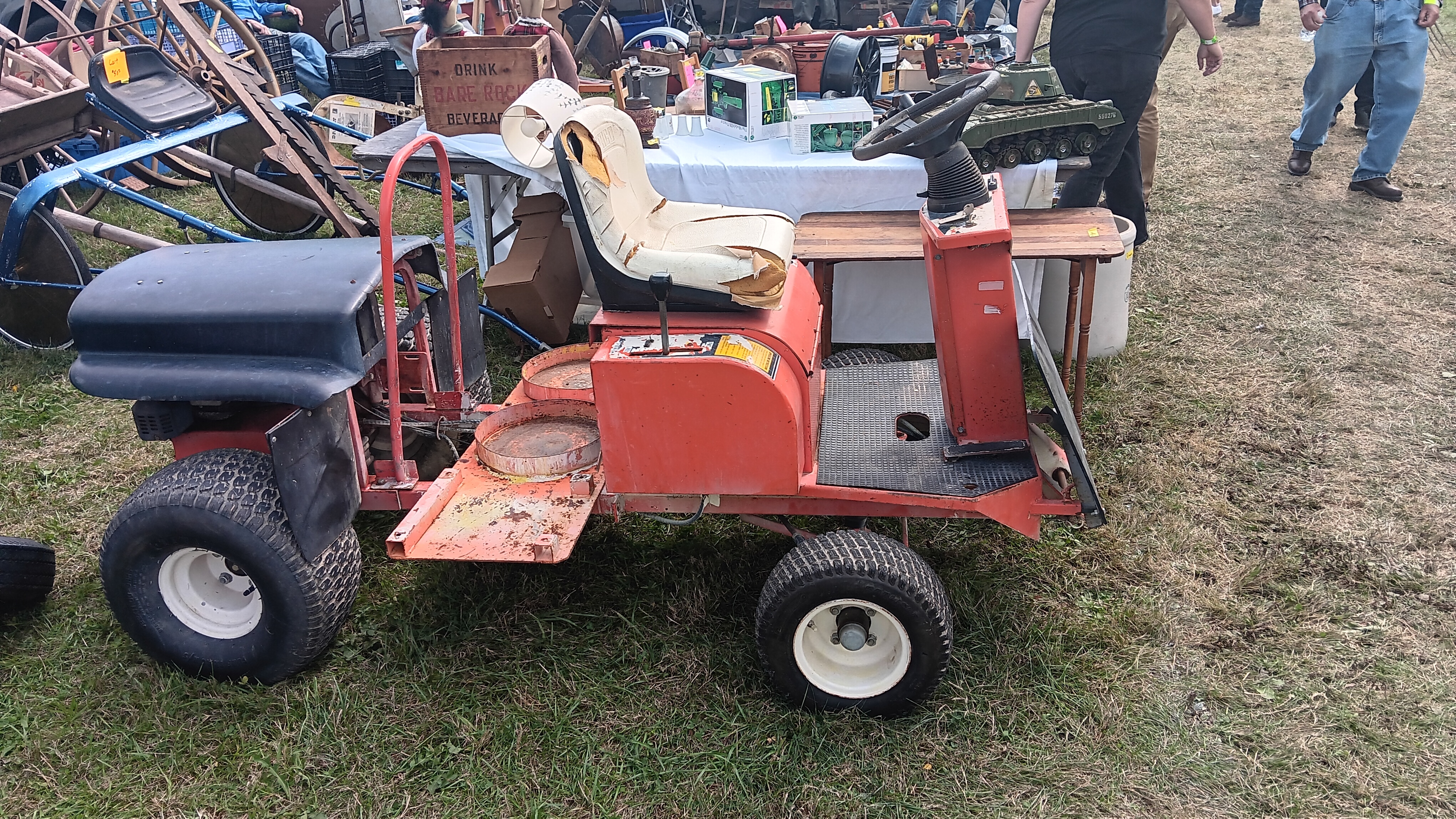 flea market. It runs quite well, and the Eaton hydro trans axle is quite smooth and controllable even at idle. My intentions are to add another seat, either side by side or front & back and hopefully some sort of 'bed' to haul items. We do have a golf cart, but most all the shows now require insurance on them which is about $75/year. However, "Buggies", riding lawn mowers with wider seats, tractors, any contraption, etc, are not required to have insurance......yet. Thus, my plan. Plus I think it's quite quirky and cool.
