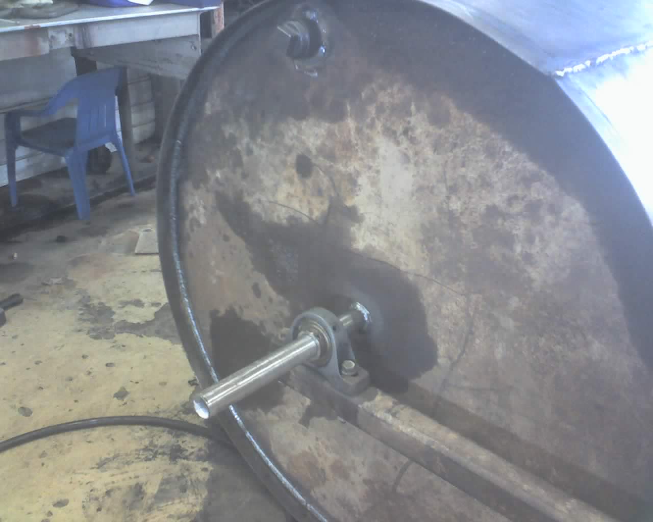 Being on a budget as most everyone is, weld a 2" or even a 3" pipe stub to the tank ends and make oak bearings to fit the pipe. Add a grease fitting as everyone likes to grease stuff. Wooden bearings were used on combines for years at a lot higher speeds than a roller.