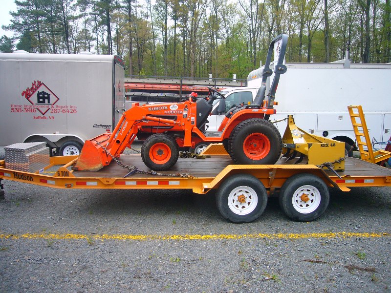 2007 B7610, 245 hrs, LA352 BH, Bush Hog SBX 48 box blade, '07 Hudson HSE Deluxe - 5 Ton 18' foot dovetail trailer for w/ 2 chains and load binders.