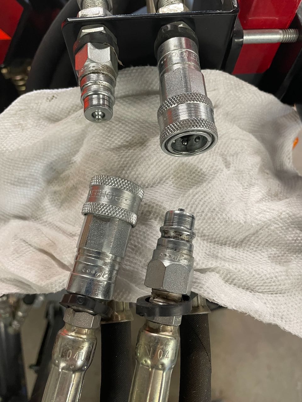 I have a Gearmore 3 spool hydraulic control valve for a top-n-tilt kit that the Kubota dealer installed installed when I bought my B2620 in 2008. I've only ever used 2 of the 3 remotes. Now I'm getting a flail mower with hydraulic side shift, so I'll be using the 3rd remote with it. The flail mower will come with the hydraulic hoses, but not the couplings, and I need to figure out what to order. Here's a picture of what I currently have, with one of in-use remotes uncoupled: